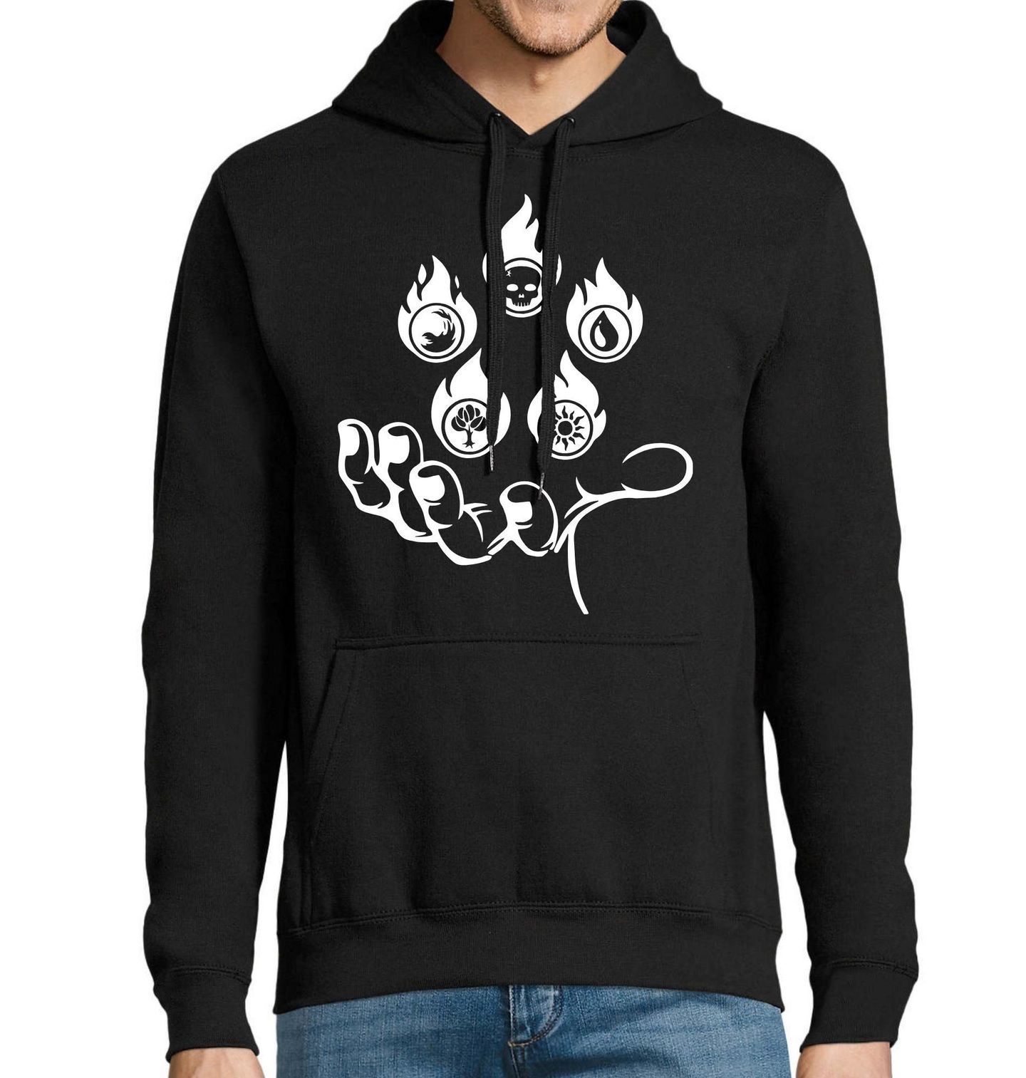 Pánská mikina Magic: The Gathering Síla Živlů. Symbolika pěti živlů – oheň, voda, příroda, slunce a temnota – zobrazená ve stylizovaných plamenech. Magic: The Gathering (zkráceně MTG) je sběratelská karetní hra. V roce 1993 ji vydala firma Wizards of the Coast v USA a rychle se rozšířila do většiny světa.
