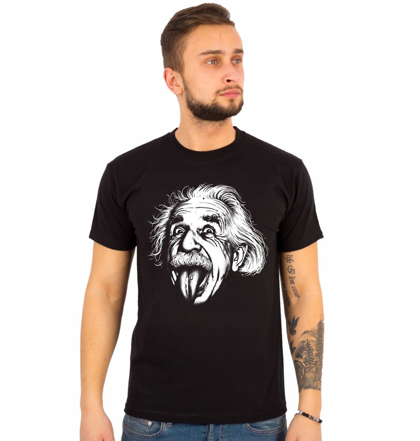 Pánské tričko Šílený Vědec Albert Einstein. Tento motiv zachycuje slavný okamžik, kdy Albert Einstein vyplázl jazyk a připomněl světu, že i génius může mít smysl pro humor. Černobílý, detailně vykreslený potisk je ideální pro každého, kdo miluje vědu, originalitu a trochu rebelie v každodenním stylu.