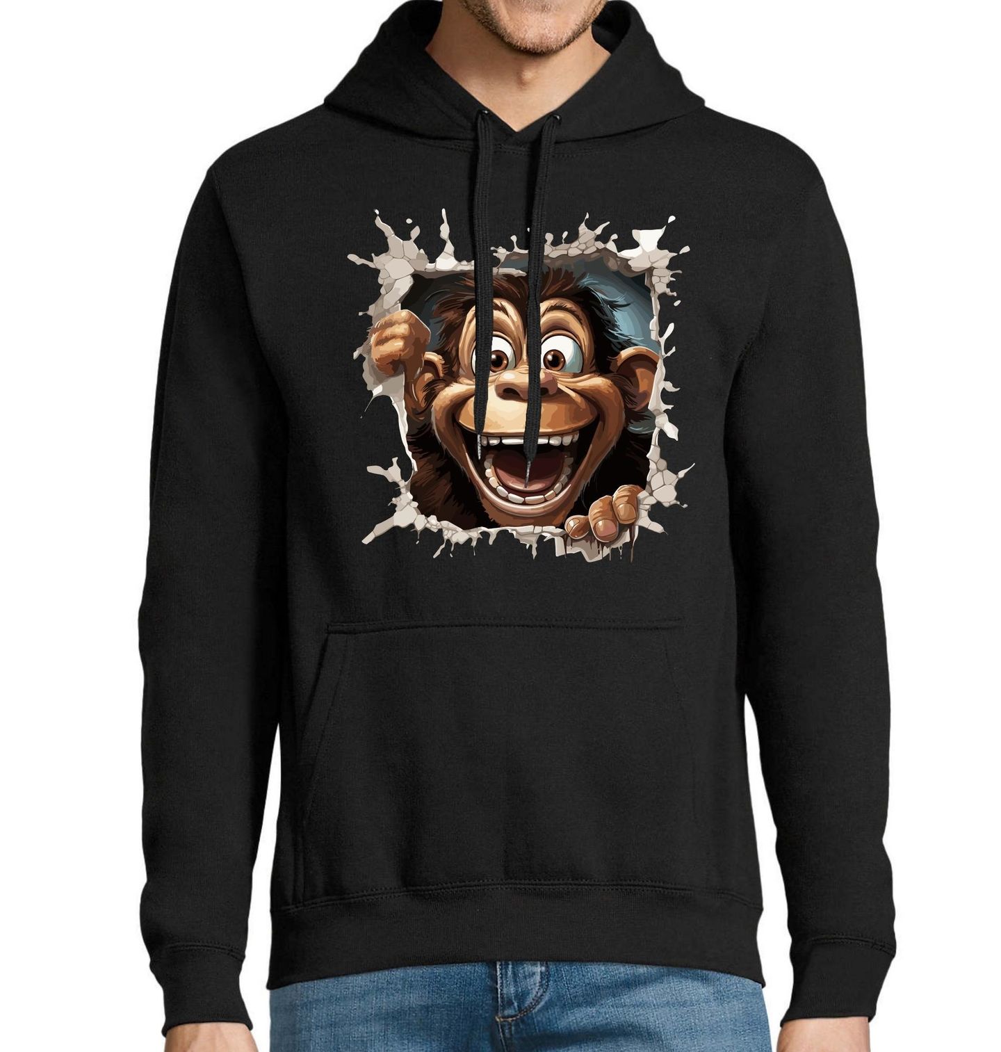 Pánská mikina Šimpanz pod Kůží. Vtipný a energický motiv, na kterém usměvavá opice proráží zeď a vytváří hravý 3D efekt plný pohybu a radosti. Ilustrace působí komiksovým stylem a hodí se pro všechny, kteří mají rádi humor, zvířecí motivy a výrazný design. Opice zde symbolizuje zvědavost, hravost a dobrou náladu, díky čemuž se motiv skvěle hodí na každodenní nošení i jako originální dárek.