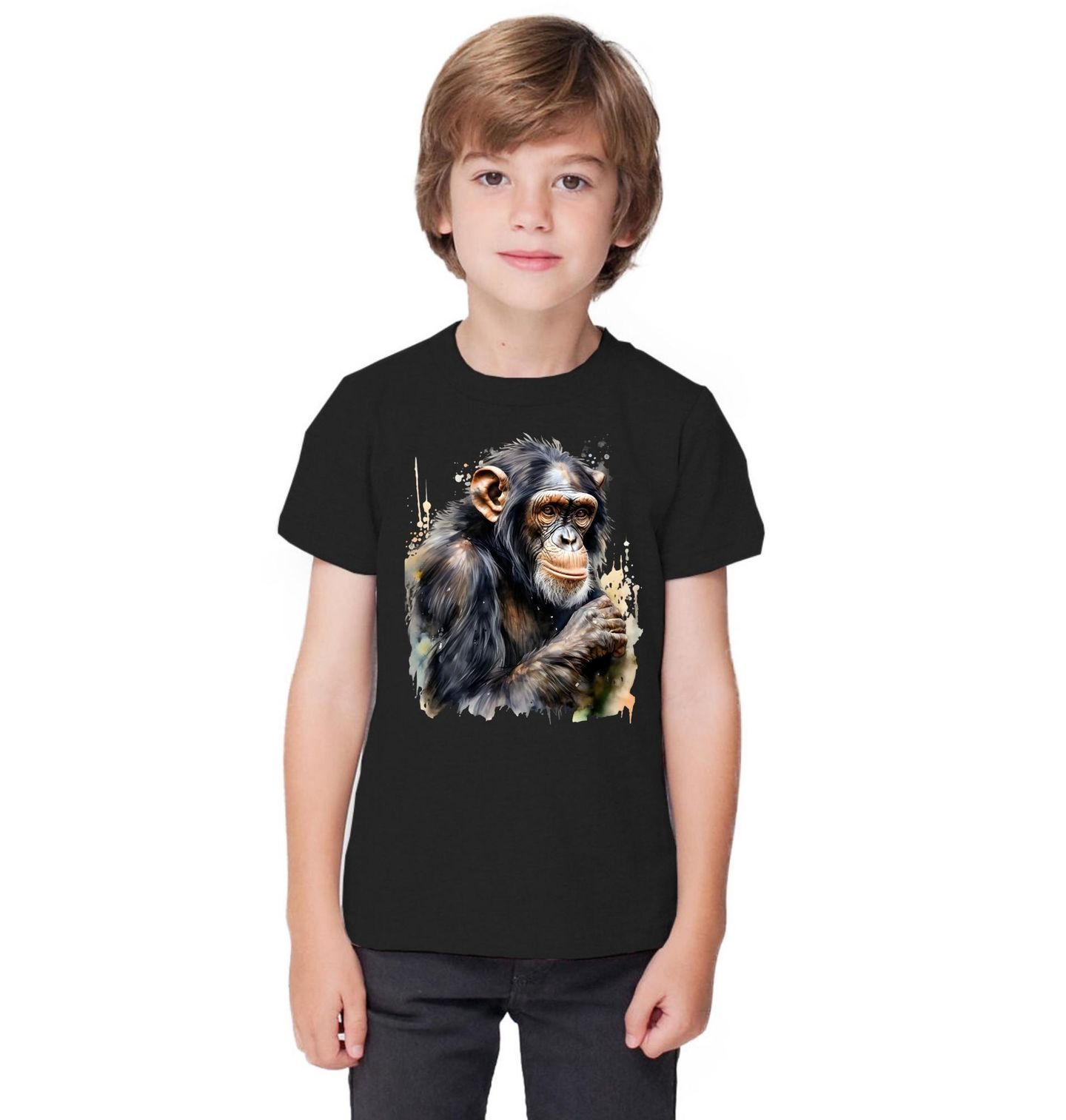 Dětské tričko Šimpanz učenlivý. Tato opice je africký lidoop. Společně s bonobem je nejbližším žijícím příbuzným člověka a je mu ze všech primátů nejpodobnější. Minimalistické pozadí nechává vyniknout tvář opice a dodává motivu moderní styl vhodný pro každodenní nošení. Ideální volba pro každého, kdo chce výrazný a přitom elegantní zvířecí motiv.