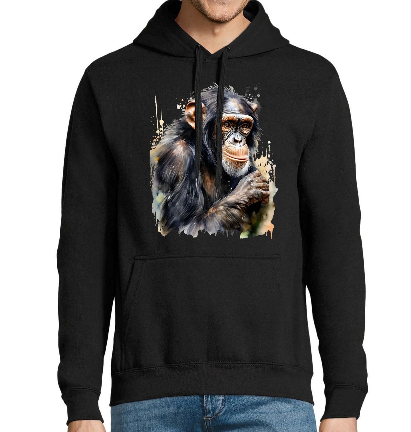 Pánská mikina Šimpanz učenlivý. Tato opice je africký lidoop. Společně s bonobem je nejbližším žijícím příbuzným člověka a je mu ze všech primátů nejpodobnější. Minimalistické pozadí nechává vyniknout tvář opice a dodává motivu moderní styl vhodný pro každodenní nošení. Ideální volba pro každého, kdo chce výrazný a přitom elegantní zvířecí motiv.