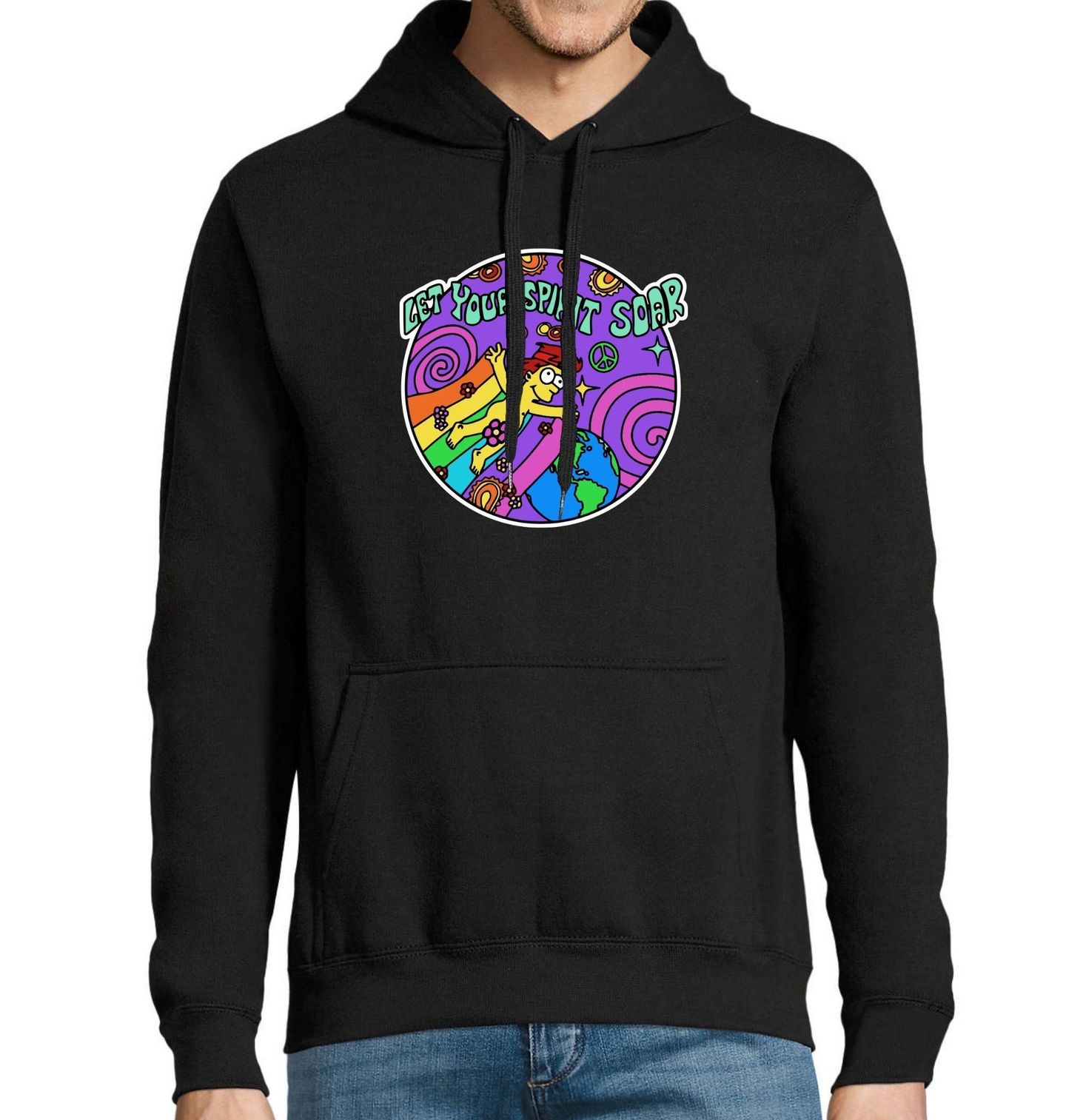 Pánská mikina Simpsonova Cesta k Míru Let Your Spirit Soar. Postava ve stylu Simpsons letí vesmírem po duhové skluzavce kolem planety Země, obklopená květinami, hvězdami a symbolem míru. V pozadí se vlní psychedelické vzory a nad tím vším září heslo Let Your Spirit Soar = Nech Svého Ducha Vzlétnout. Tričko je ideální pro milovníky popkultury, míru, Simpsonů a 70s hippie estetiky.