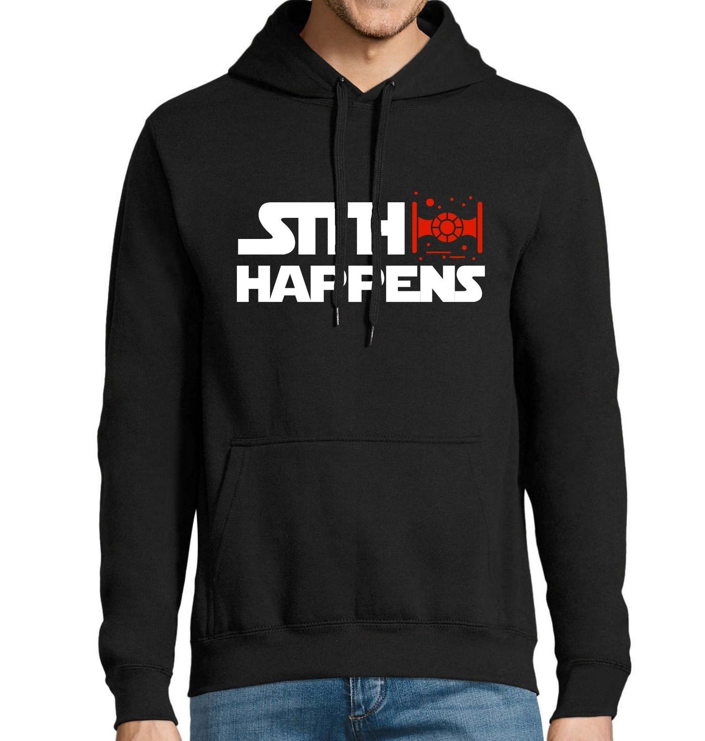 Pánská mikina Sith Happens Star Wars. Když ti v životě všechno padá jako Hvězda smrti… prostě Shit happens. Parodie na legendární filmovou ságu Star Wars, ideální pro každého fanouška temné strany, který ví, že i ve vesmíru občas přijde den blbec.
