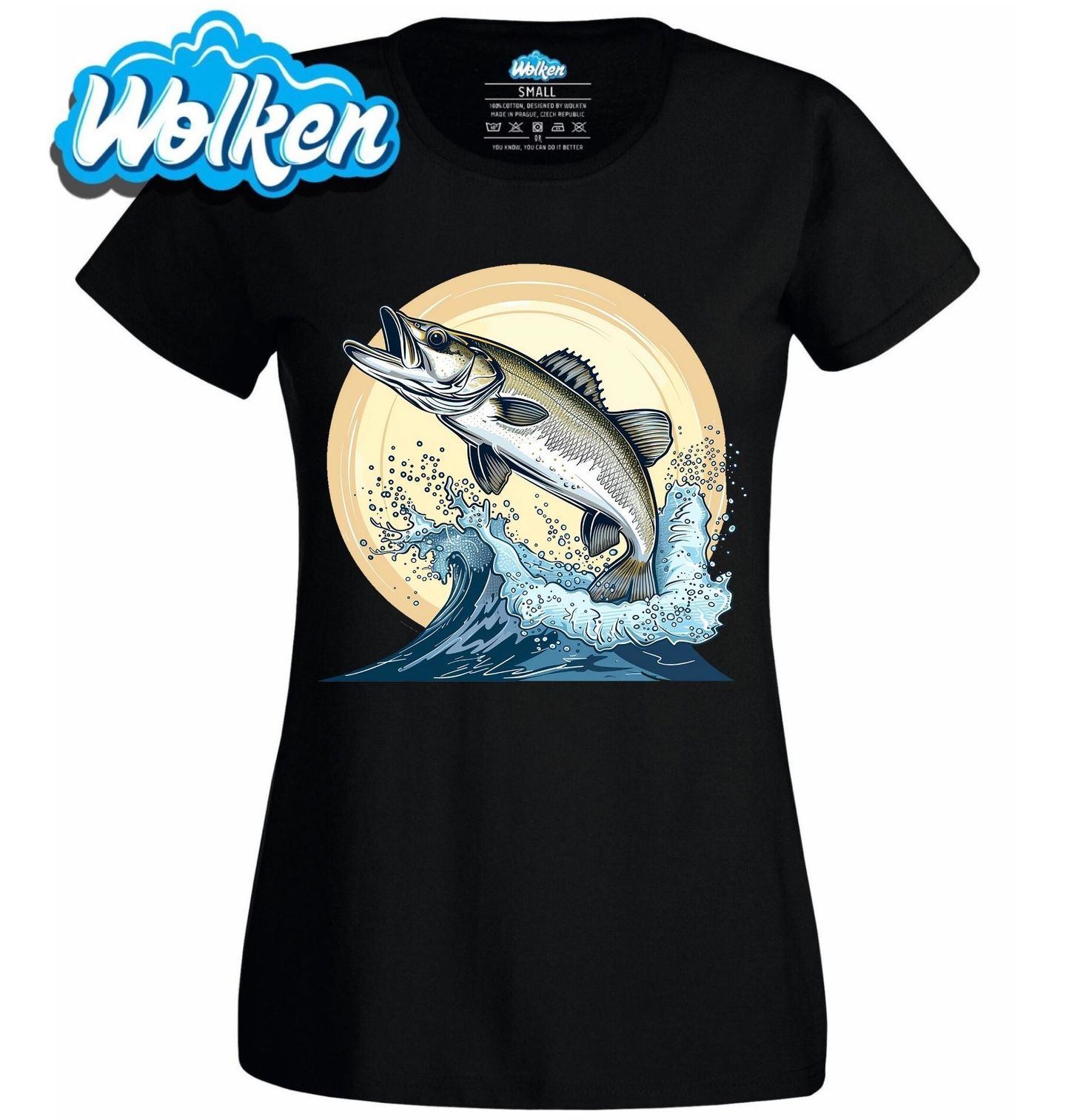 Dámské tričko Skákající Candát. Tento originální motiv s vyobrazením candáta obecného v dynamickém skoku z vody potěší každého vášnivého rybáře. Perfektní pro všechny milovníky rybaření, kteří ocení detailní ilustraci této dravé ryby v akci. Vyjádři svou vášeň pro lov trofejních ryb stylově!