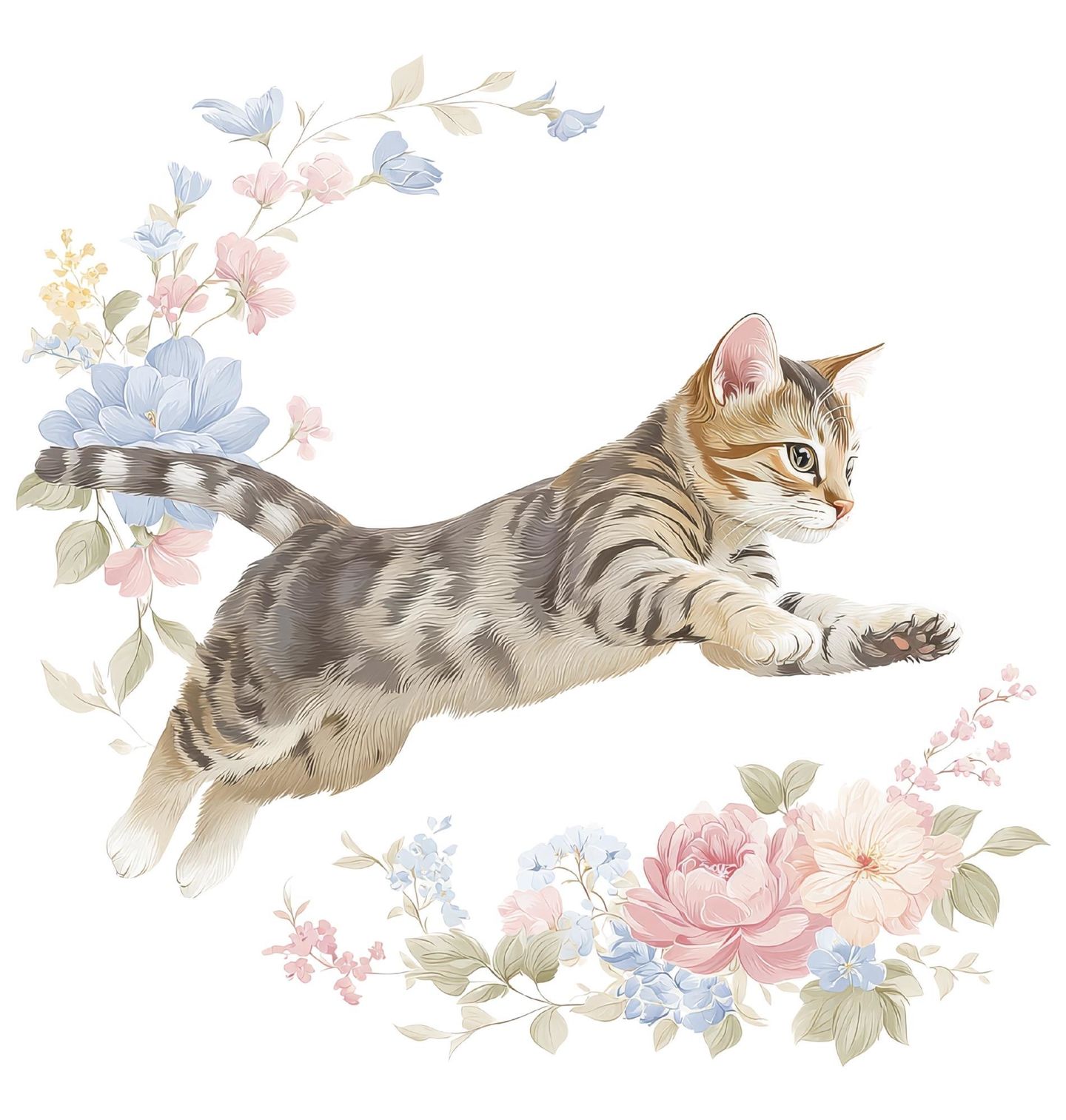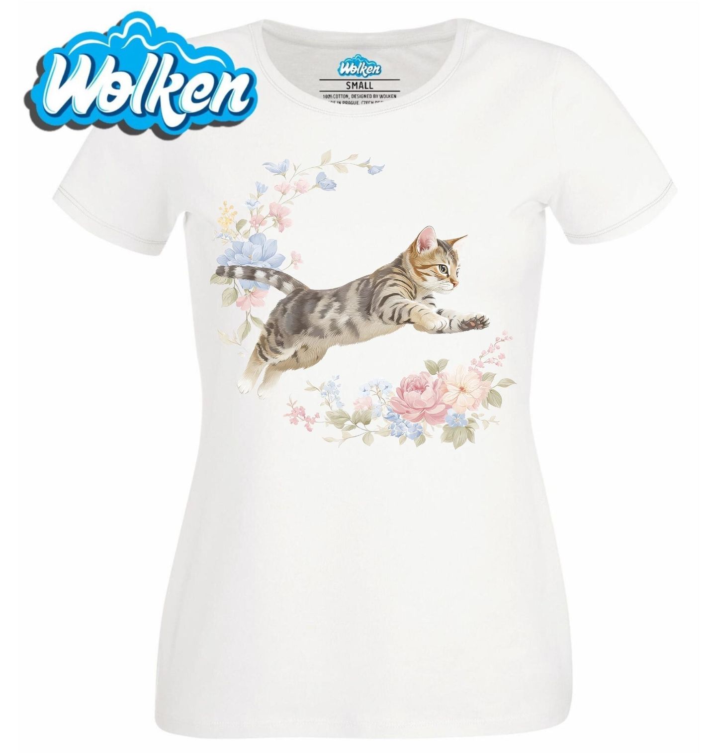 Dámské tričko Skákající Kočka mezi Květinami. Roztomilá kočka elegantně skáče mezi jemnými pastelovými květinami, vytvářejícím pocit lehkosti a harmonie. Tento motiv je ideální pro všechny milovníky koček a květin, kteří chtějí přidat do svého šatníku nádech něžnosti a radosti.