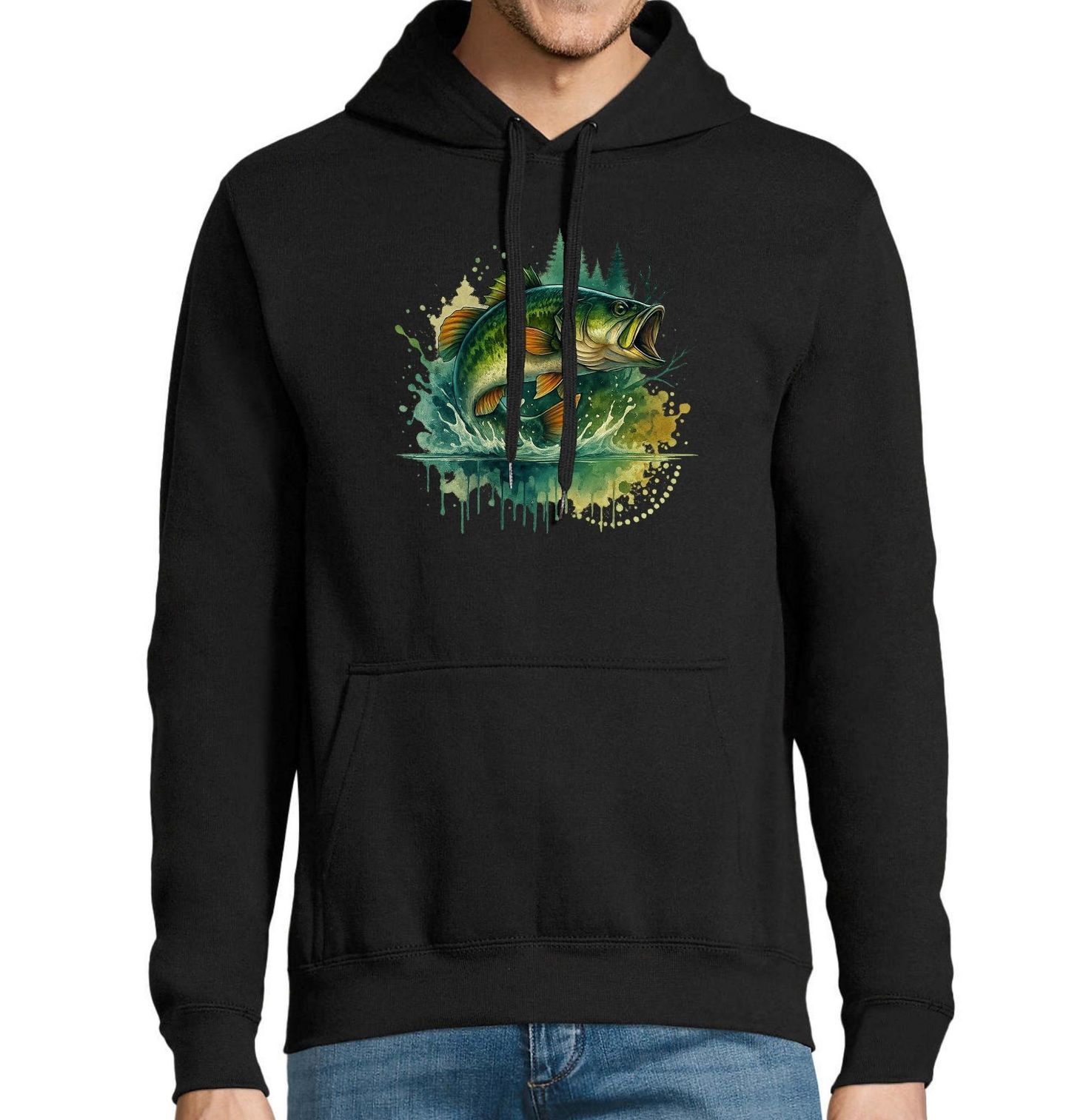 Pánská mikina Skákající Okoun. Dravý okoun velký (Micropterus salmoides), zachycen v dynamickém výskoku nad hladinu. Barevně sytá ilustrace kombinuje ztvárnění ryby s uměleckým stříkancem vody a lesním pozadím, což dává triku energický a přírodní vzhled. Skvělý kousek pro rybáře a milovníky rybaření.