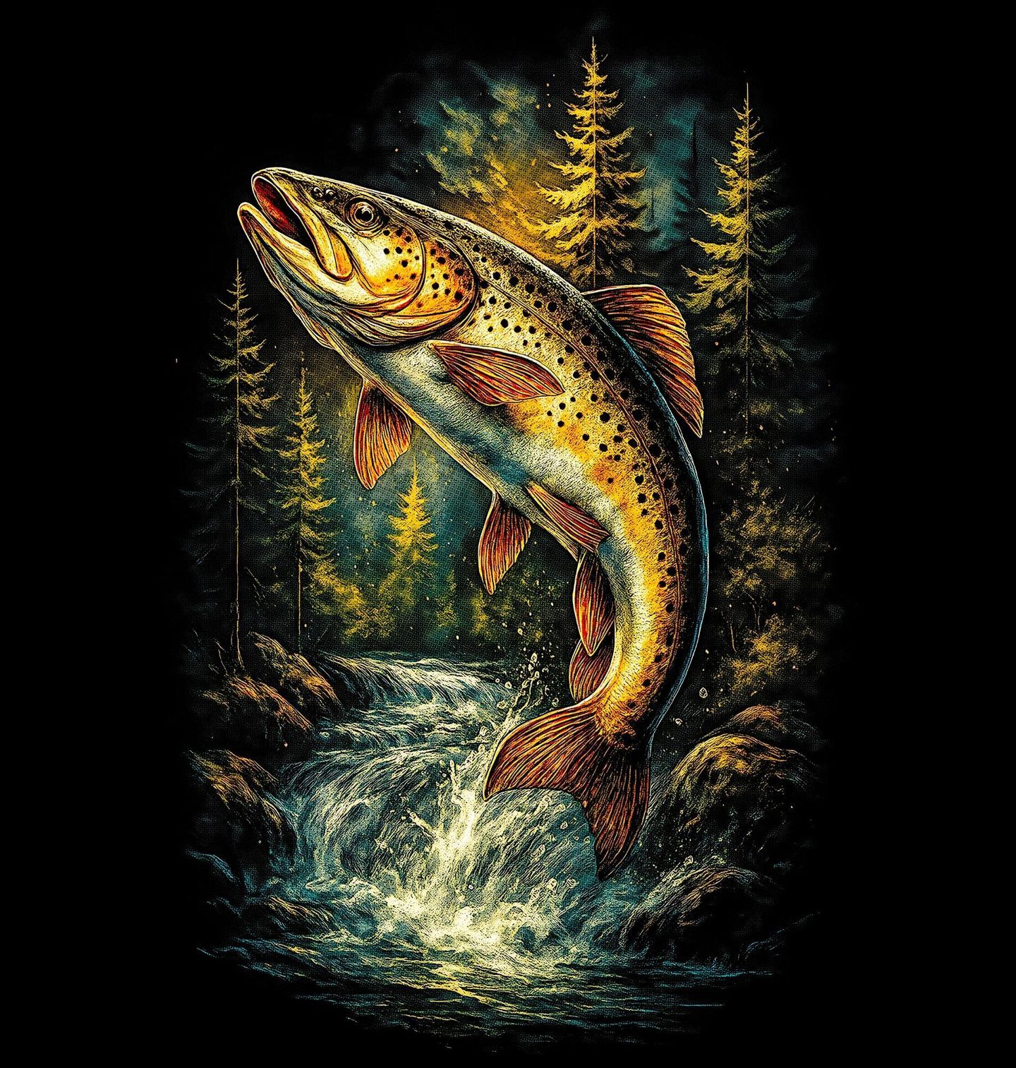 Dětské tričko Skákající Pstruh obecný. Pstruh obecný je symbolem čisté vody, respektu k přírodě a poctivého přístupu. Pro každého, kdo miluje rybaření, představuje opravdovou výzvu i radost. Zkušený rybář ví, že lov pstruha není jen o úlovku, ale o tichu lesa, proudu řeky a souznění s krajinou.