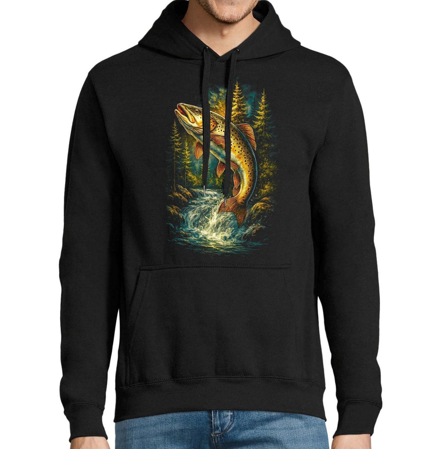 Pánská mikina Skákající Pstruh obecný. Pstruh obecný je symbolem čisté vody, respektu k přírodě a poctivého přístupu. Pro každého, kdo miluje rybaření, představuje opravdovou výzvu i radost. Zkušený rybář ví, že lov pstruha není jen o úlovku, ale o tichu lesa, proudu řeky a souznění s krajinou.