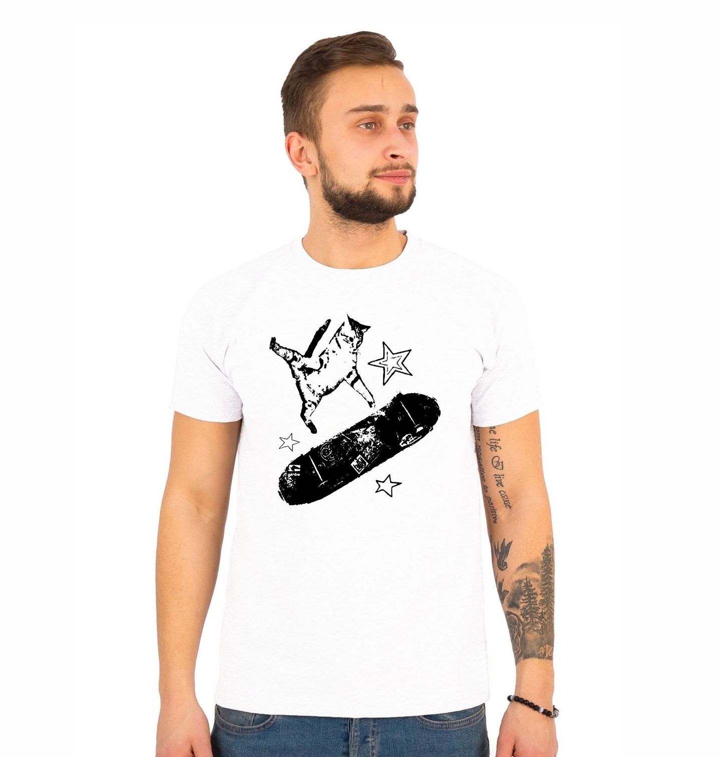 Pánské tričko Skate Kočka. Dynamický motiv kočky na skateboardu působí energicky. Jednoduchý styl zdůrazňuje pohyb a svobodu. Design kočky je perfektní pro milovníky street stylu.