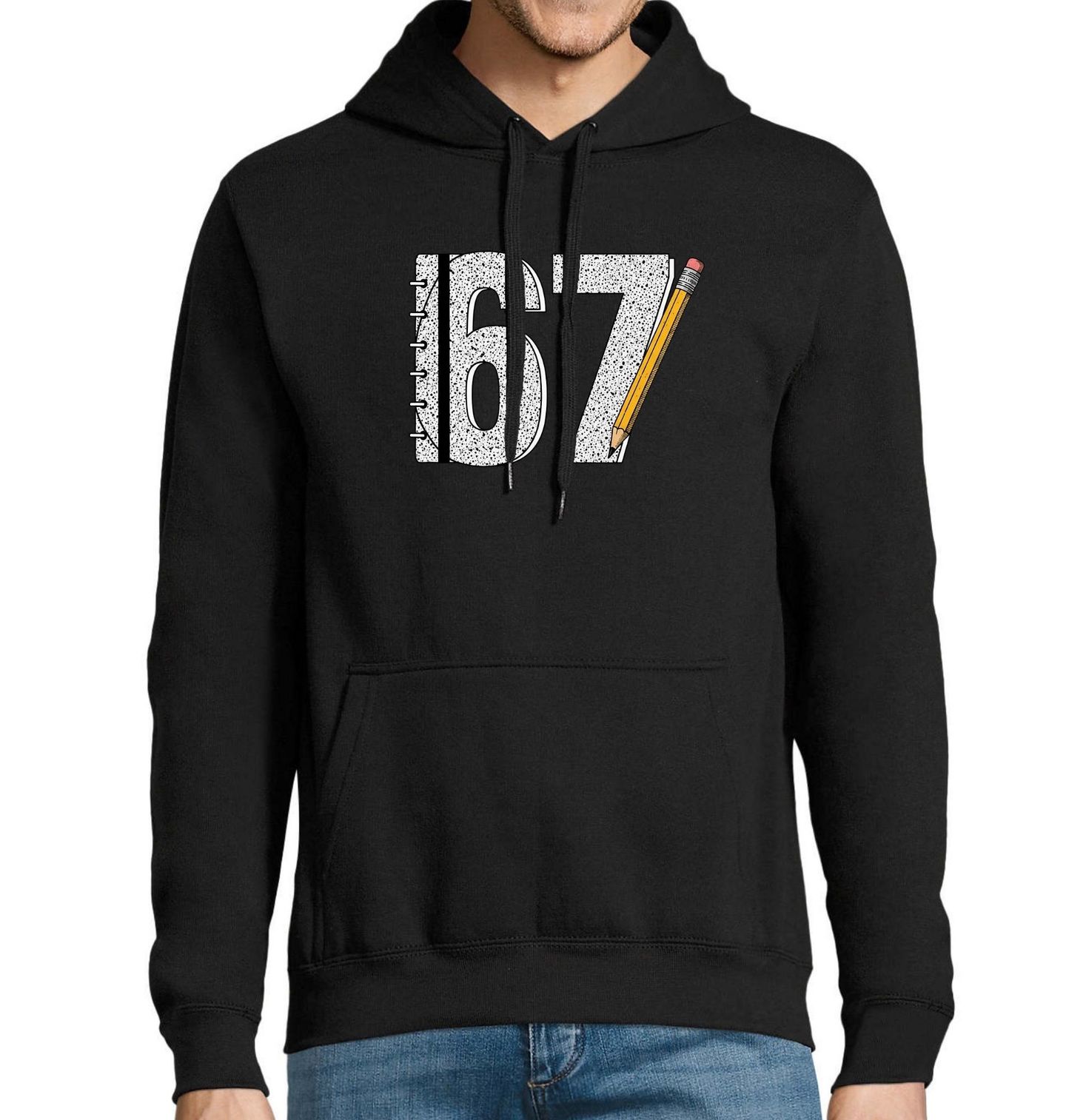 Pánská mikina Školní Sešit 67 Six Seven. Originální motiv 67 ve stylu školního sešitu s tužkou je ideální pro fanoušky fenoménu six seven a internetových vtipů meme. Číslo 67 je zpracované tak, že připomíná linkovaný zápisník, doplněný klasickou žlutou tužkou – perfektní design pro studenty, učitele, školáky i všechny, kdo milují kreativní a hravý styl.