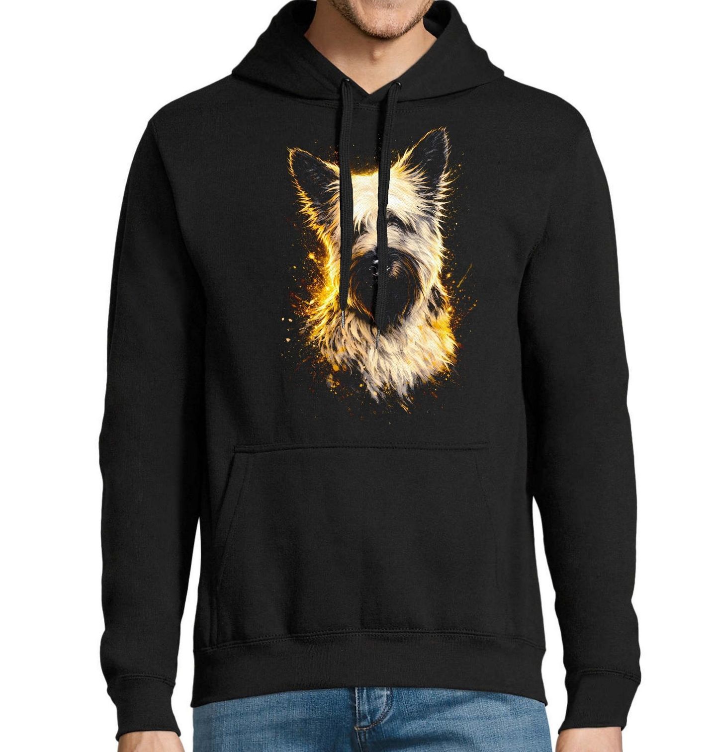 Pánská mikina Skotský Teriér Bílý. Tento výrazný motiv zachycuje charismatického psa plemene Skotský teriér v moderním, zářivém stylu plném kontrastních barev. Detailní ilustrace zdůrazňuje typickou dlouhou srst, výrazné vousy a vztyčené uši, které dávají tomuto plemeni nezaměnitelný vzhled. Tento pes je symbolem odvahy, elegance a osobitosti. Perfektní volba pro každého pejskař, který chce ukázat svou lásku ke psům stylově a originálně.