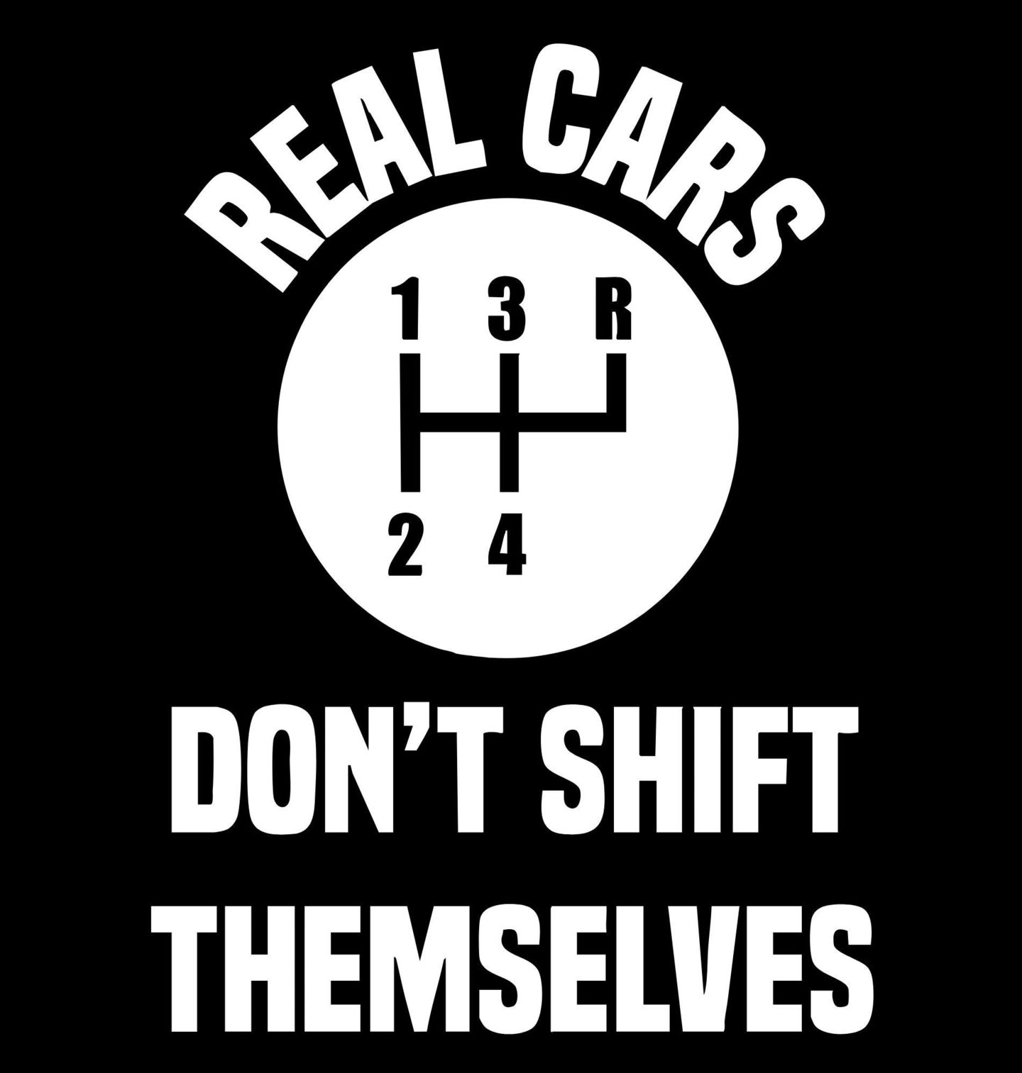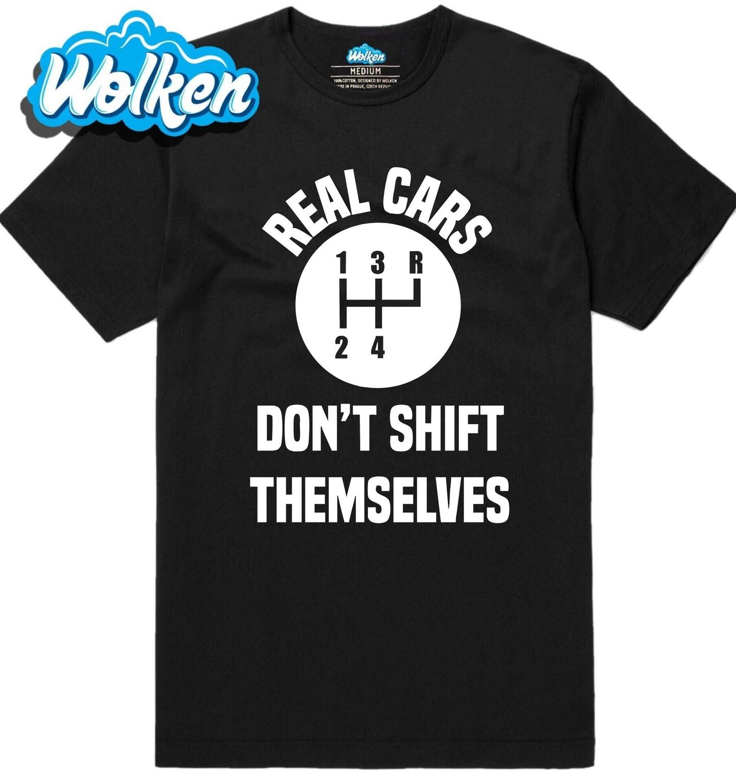 Pánské tričko Skutečná Auta Neřadí Sama. Motiv pro všechny pravé milovníky řízení, kteří vědí, že auto má řidič ovládat – ne naopak. Na designu je schéma klasické manuální převodovky a nápis: „Real cars don’t shift themselves“ (v překladu: „Skutečná auta sama neřadí.“)