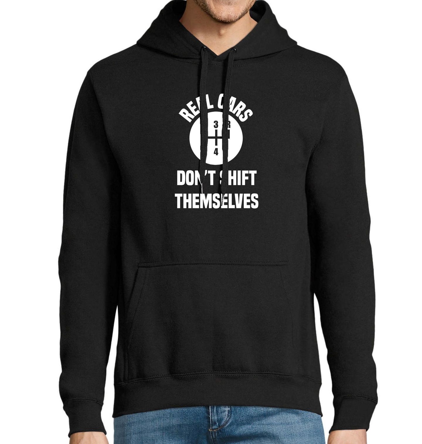 Pánská mikina Skutečná Auta Neřadí Sama. Motiv pro všechny pravé milovníky řízení, kteří vědí, že auto má řidič ovládat – ne naopak. Na designu je schéma klasické manuální převodovky a nápis: „Real cars don’t shift themselves“ (v překladu: „Skutečná auta sama neřadí.“)