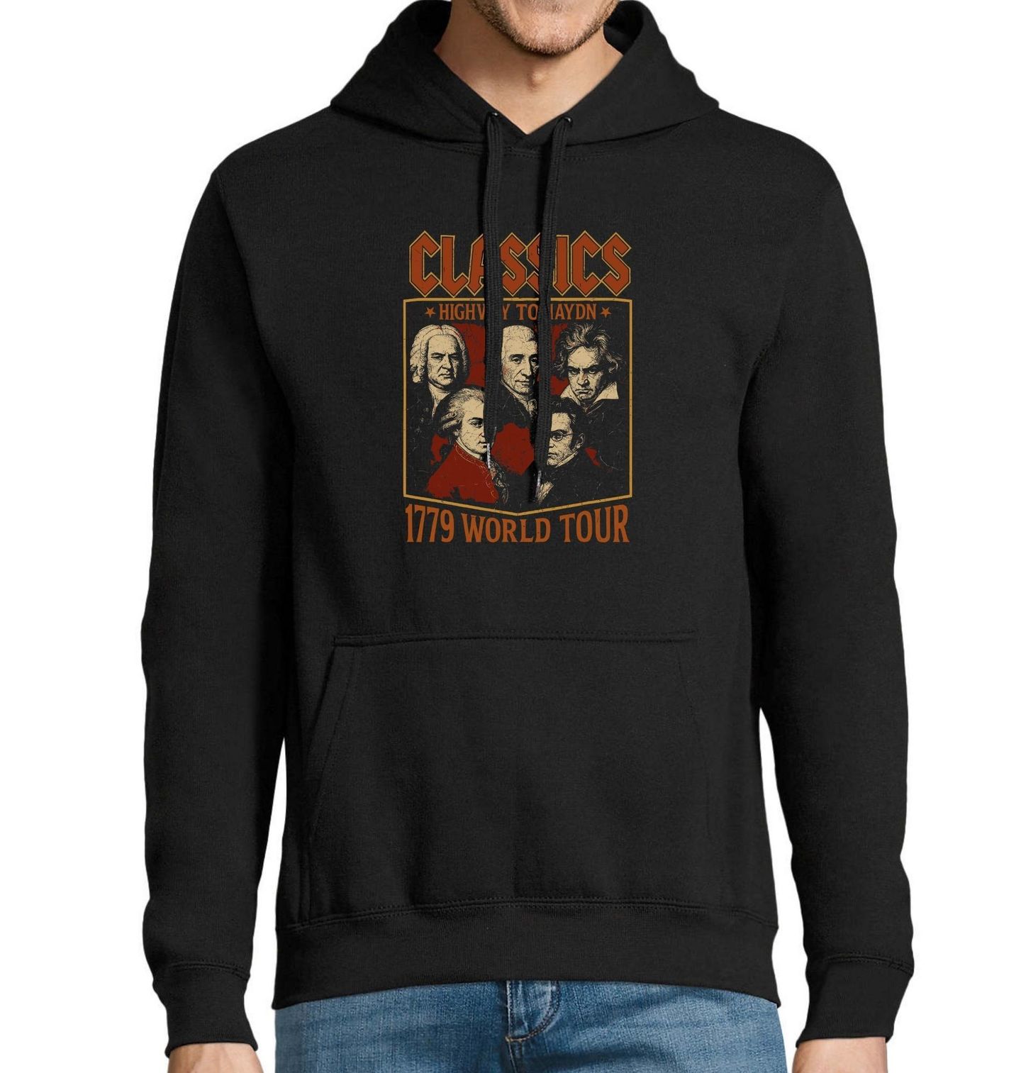 Pánská mikina Slavní Skladatelé Classics Highway to Haydn 1779 World Tour. Na motivu jsou zobrazeni slavní skladatelé: Johann Sebastian Bach, Joseph Haydn, Wolfgang Amadeus Mozart, Ludwig van Beethoven, Franz Schubert Tito mistři klasiky jsou ztvárněni ve stylu plakátu rockové šňůry. „HIGHWAY TO HAYDN“ je slovní hříčka inspirovaná názvem slavné rockové písně „Highway to Hell“ od AC/DC.