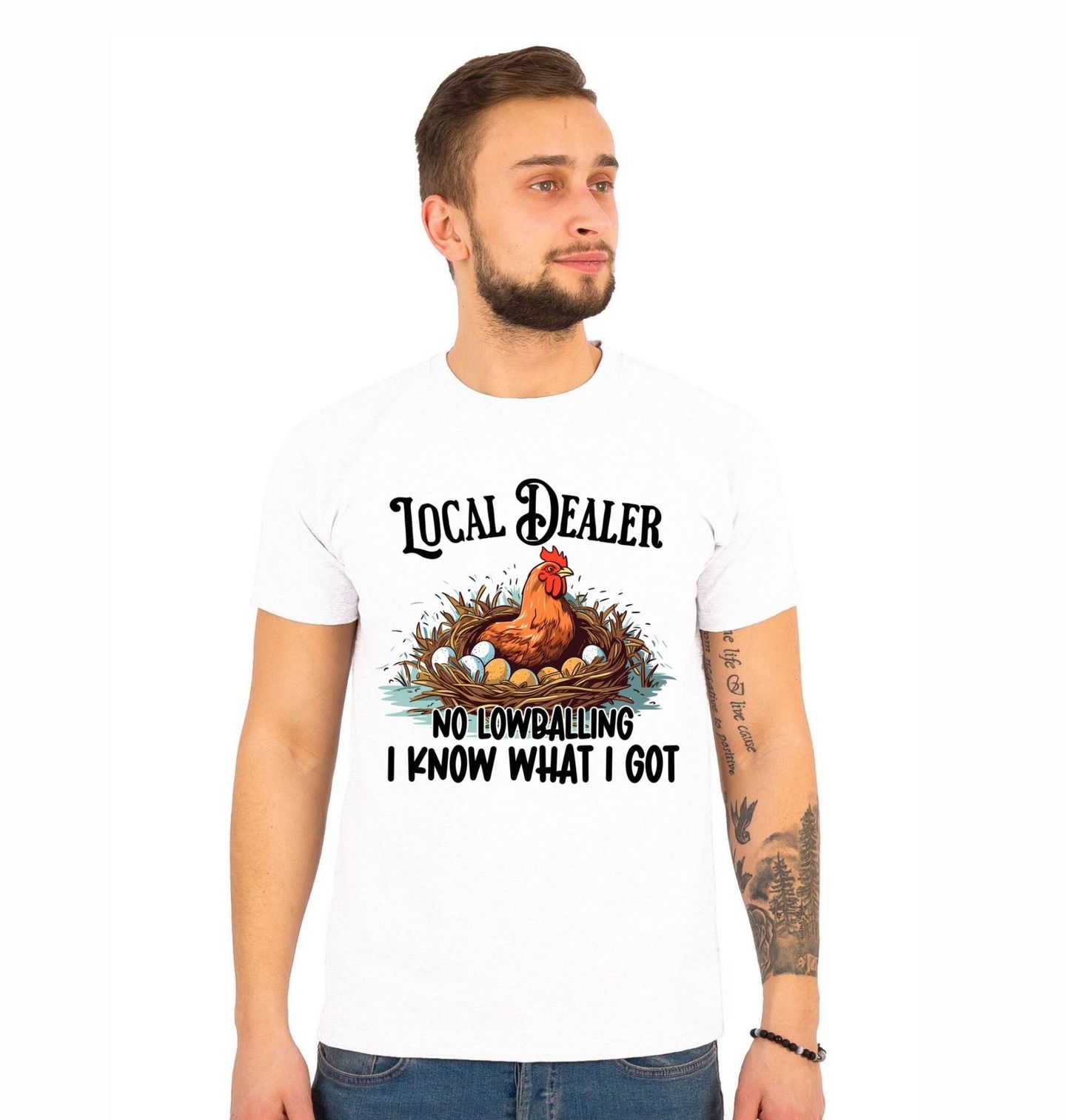 Pánské tričko Slepice Local Dealer. Slepice sedící na hnízdě s vejci působí sebejistě a vtipně odkazuje na svou hodnotu. Nápis „Local Dealer – No Lowballing, I Know What I Got“ znamená v překladu „Místní prodejce – žádné směšně nízké nabídky, vím, co mám“, což dodává motivu humorný a dvojsmyslný nádech.