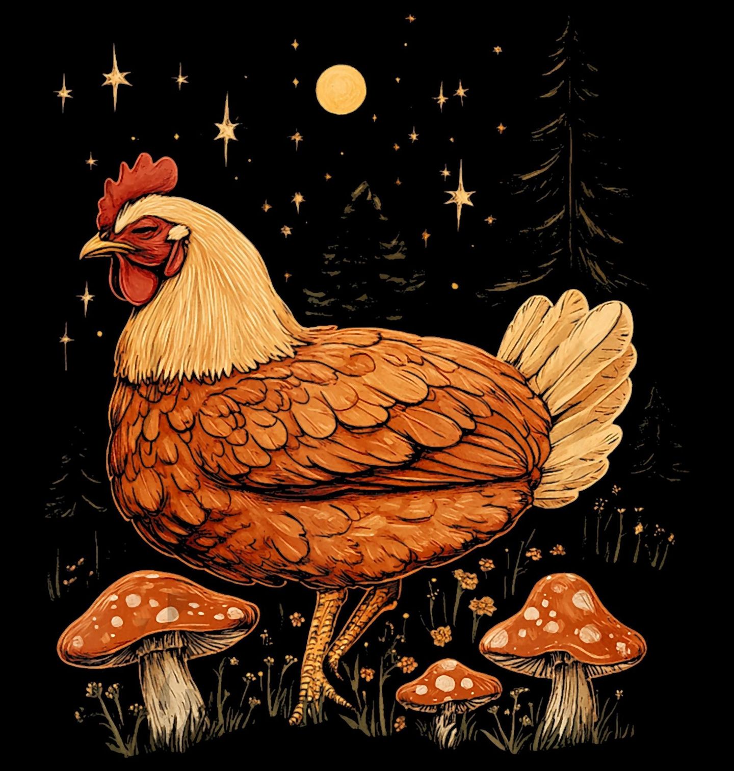 Dámské tričko Slepice mezi Muchomůrkami. Originální motiv, který spojuje klid nočního lesa, rozkvetlé květy, zářící houby a elegantní slepici pod hvězdným nebem. Ideální pro milovníky vesnické pohody, lesní magie nebo prostě těch, co mají rádi neotřelý a vtipný design s přírodním nádechem.
