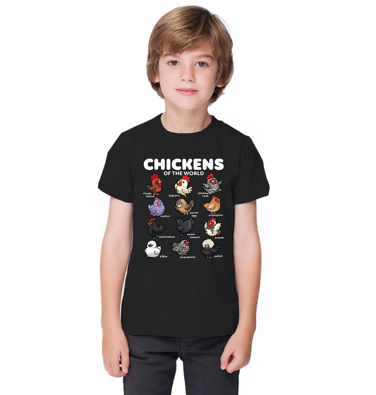 Dětské tričko Slepice z Celého Světa Chickens of the world. Roztomilý a hravý motiv pro každého farmáře pro koho je farma domovem. Na obrázku jsou ilustrované různé druhy slepice z celého světa – například Rhode Island, Leghorn, Plymouth Rock, Cochin, Easter Egger, Orpington, Australorp, Ayam Cemani, Sussex, Silkie, Wyandotte a Polish.