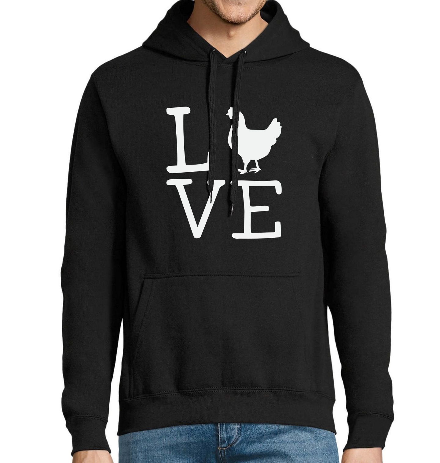 Pánská mikina Slepičí Láska Chicken Love. Pro všechny, kdo milují slepice víc než průměrný snídaňový bufet. Stylový a minimalistický design slova LOVE, kde „O“ hravě nahrazuje silueta slepice. Ideální pro farmáře, chovatele, venkovské duše nebo kohokoli, kdo ví, že nejlepší kamarád může kdákat.