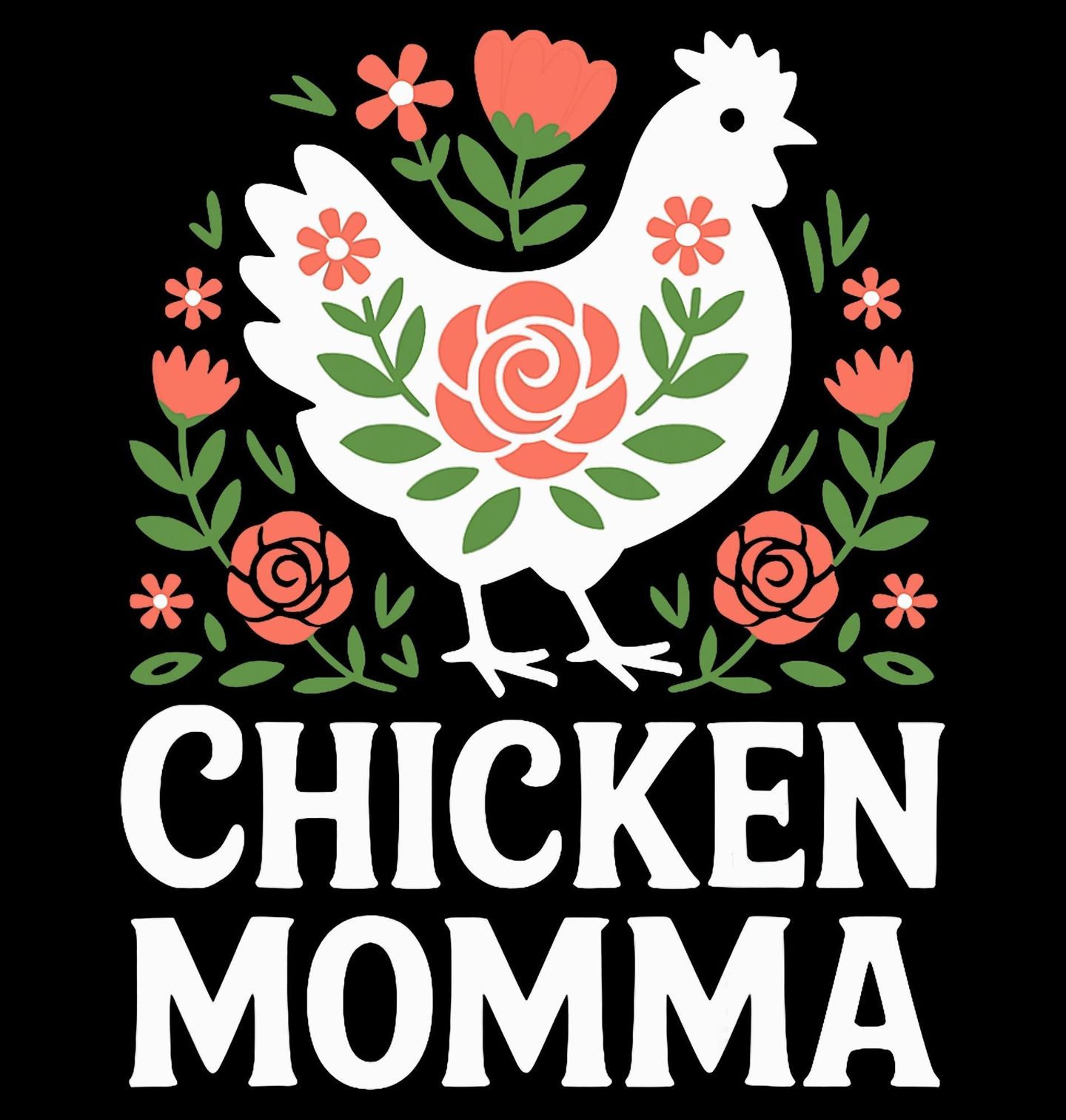Dámské tričko Slepičí Máma. Tento originální motiv s nápisem „Chicken Momma“ je ideálním dárkem pro každou ženu, která miluje slepice a venkovský styl. Bílá slepice s květinovým vzorem obklopená květy je roztomilým symbolem péče, klidu a radosti z chovu domácích zvířat.