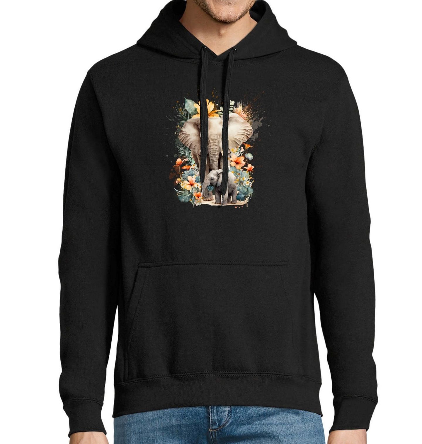 Pánská mikina Slon africký a Mládě. Krásné tričko s jemným motivem slona afrického (Loxodonta africana) – zobrazující dospělou slonici a její mládě obklopené tropickými květinami. Slon symbolizuje moudrost, ochranu a rodinné pouto. Motiv je ideální pro milovníky přírody, zvířat a exotických dekorativních motivů.