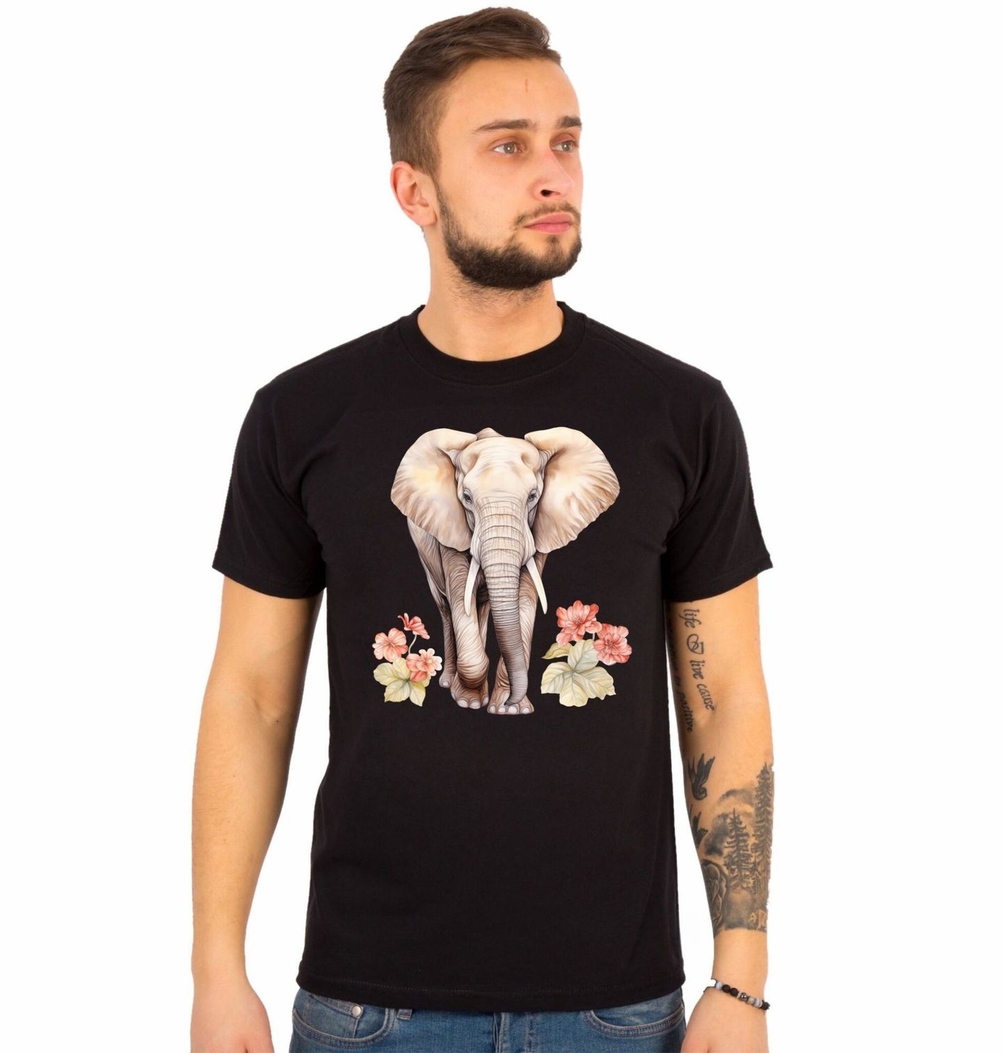 Pánské tričko Slon africký mezi Květy. Elegantní přírodní motiv, kde realisticky zpracovaný slon kráčí mezi jemnými květinami v akvarelovém stylu. Tento design působí klidně a harmonicky a osloví každého milovníka divoké přírody i exotických zvířat. Motiv zachycuje majestátního slona v přirozené podobě, doplněného jemnými botanickými prvky pro moderní a stylový vzhled.