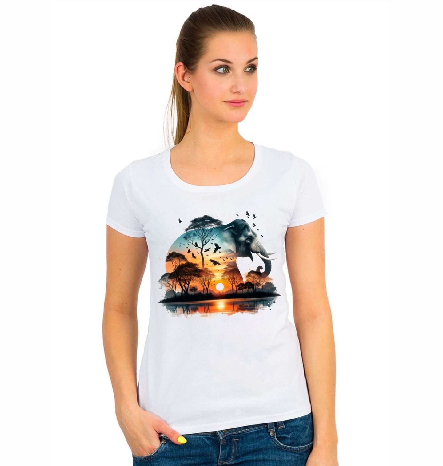 Dámské tričko Slon Africký Západ Slunce. Dvojitá expozice slona a africké krajiny při západu slunce. Siluety stromů, letící ptáci a odraz na vodní hladině vytvářejí harmonickou přírodní scénu plnou života. Vhodný dárek pro každého milovníka Afriky.