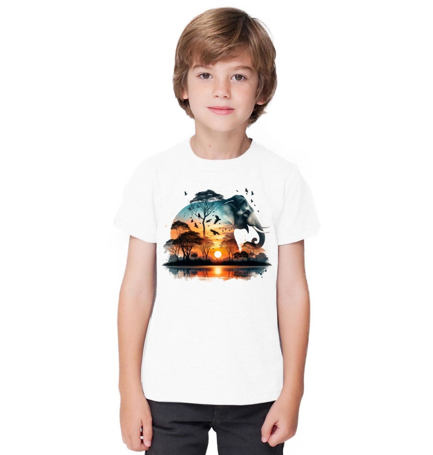 Dětské tričko Slon Africký Západ Slunce. Dvojitá expozice slona a africké krajiny při západu slunce. Siluety stromů, letící ptáci a odraz na vodní hladině vytvářejí harmonickou přírodní scénu plnou života. Vhodný dárek pro každého milovníka Afriky.