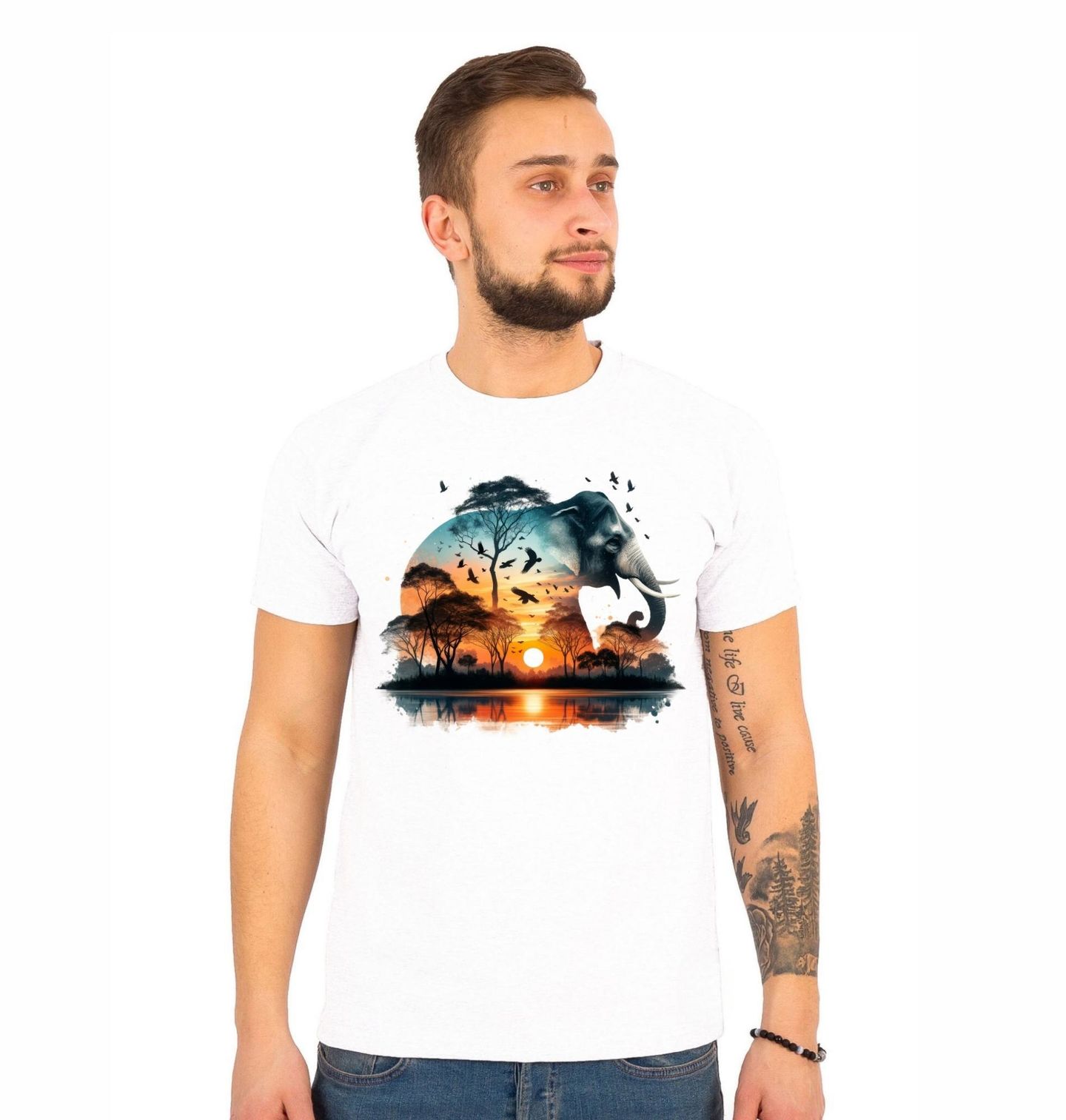 Pánské tričko Slon Africký Západ Slunce. Dvojitá expozice slona a africké krajiny při západu slunce. Siluety stromů, letící ptáci a odraz na vodní hladině vytvářejí harmonickou přírodní scénu plnou života. Vhodný dárek pro každého milovníka Afriky.