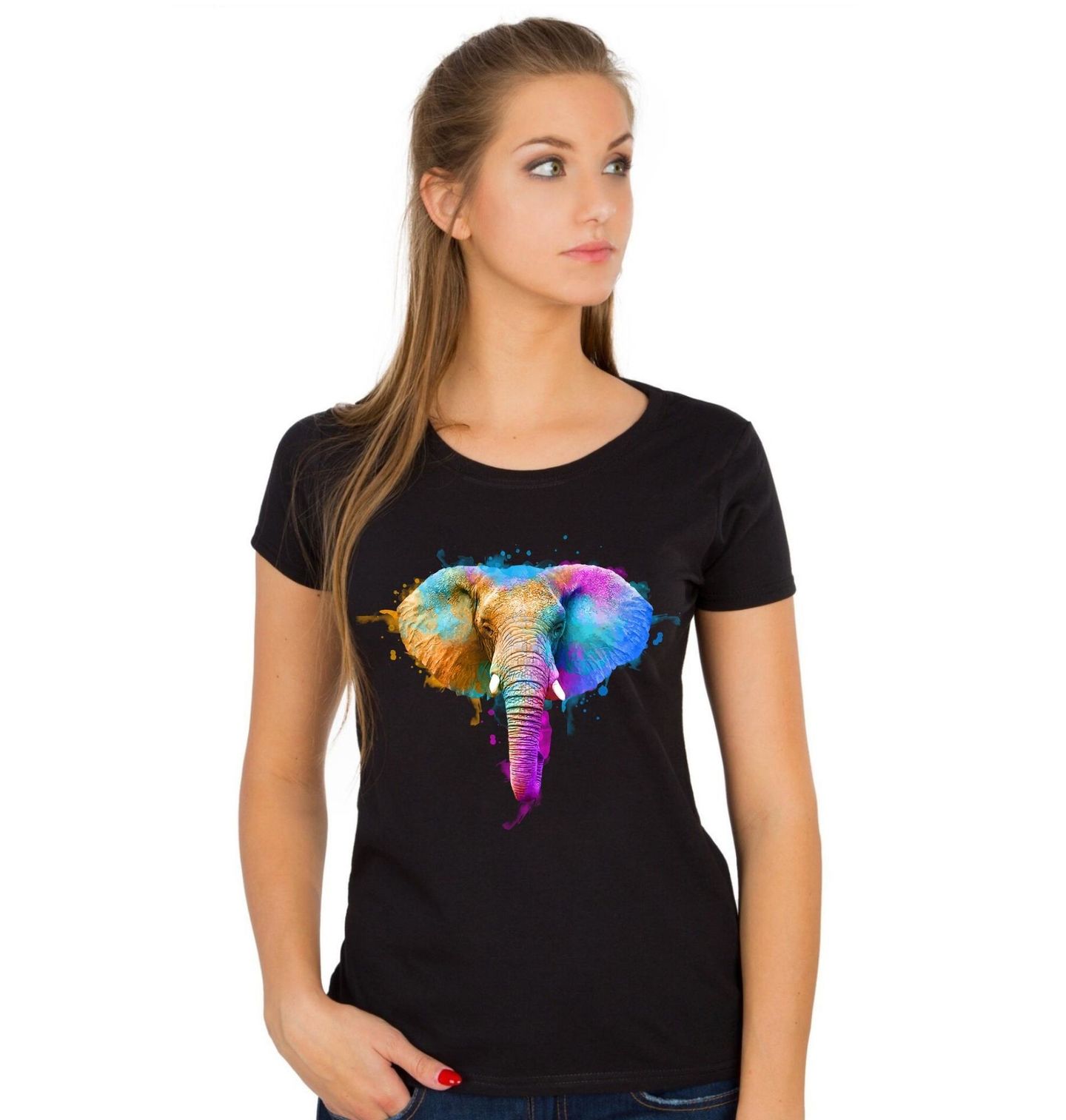Dámské tričko Slon indický Festival Barev Hólí. Hólí je indický svátek, který je oslavou jara a barev. Ve světě se Hólí nejvíce proslavil díky své bujaré formě oslavy, kdy na sebe lidé v ulicích vzájemně vrhají barevné prášky a cákají po sobě zbarvenou vodou. Slon je symbolem síly, štěstí a harmonie, a proto se motiv skvěle hodí pro každého, kdo má rád exotiku, umění a výrazné barvy.