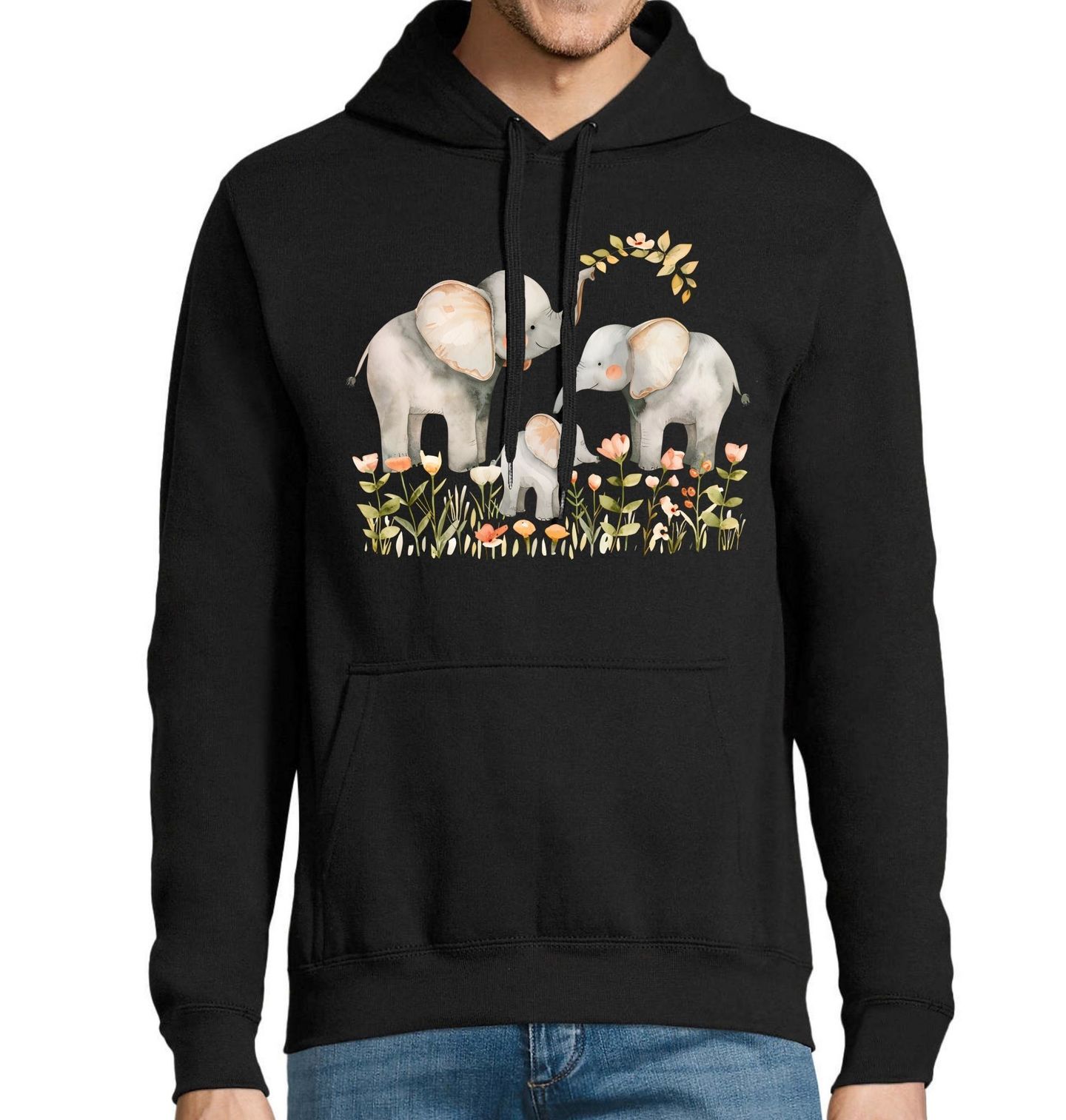 Pánská mikina Sloní Rodinka. Jemný akvarelový motiv, kde roztomilý slon a jeho sloní rodina stojí mezi květinami a vytváří něžnou atmosféru plnou klidu a lásky. Ilustrace působí hravě a zároveň elegantně, takže se skvěle hodí pro milovníky zvířat i minimalistického stylu.