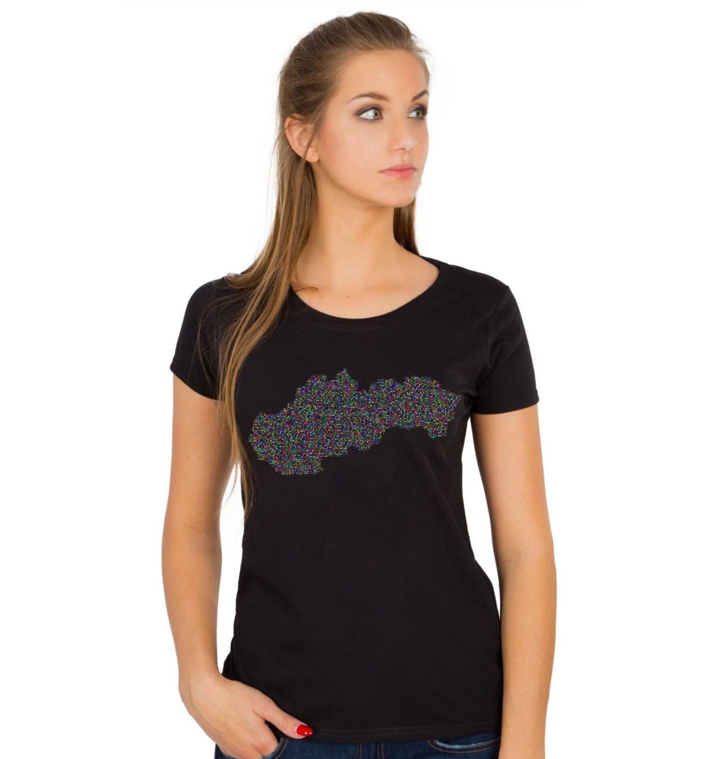 Dámské tričko Slovenská Mapa Míru. Originální mapa Slovenska složená z desítek barevných srdcí je silným vizuálním symbolem lásky, soudržnosti a přání po míru. Každé srdce v tomto motivu představuje jednotlivce, rodinu, komunitu – a dohromady tvoří celek, kterým je hrdé a krásné Slovensko.