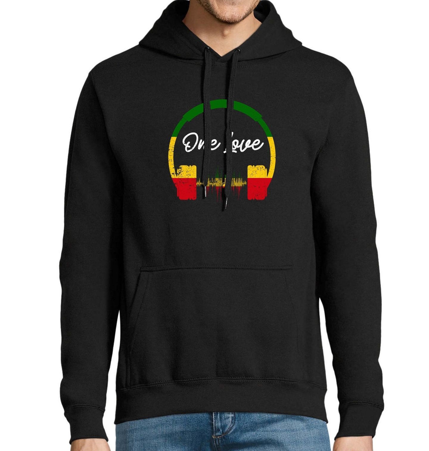Pánská mikina Sluchátka Míru One Love. One Love a barevnými sluchátky v barvách rasta vlajky (zelená, žlutá, červená) pro každého, kdo žije hudbou a šíří mír. Tyto barvy jsou symbolem rastafariánství a reggae kultury, kterou proslavil Bob Marley a jeho slavná píseň One Love. Hudba, láska a mír – prostě dokonalé tričko nejen pro hippie rasta duše a reggae fanoušky!