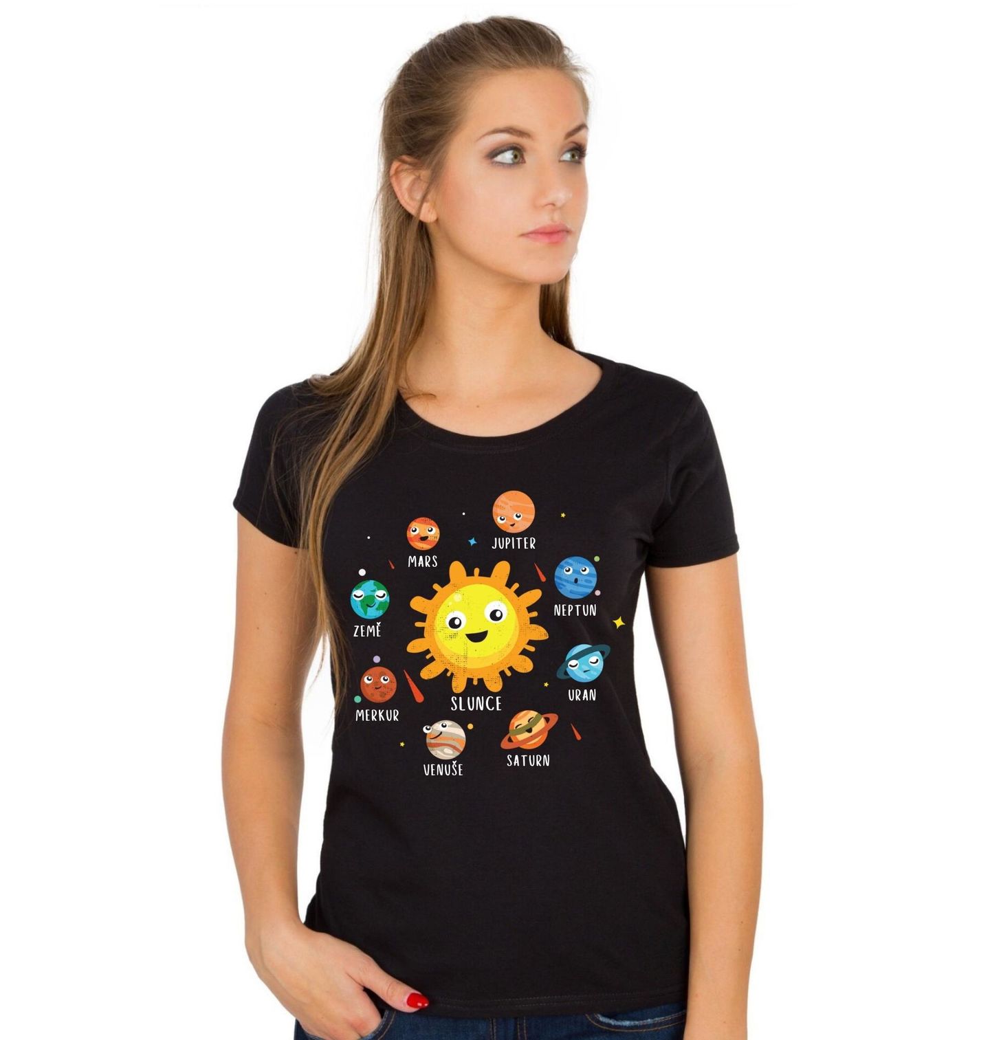 Dámské tričko Slunce a jeho Planetky. Roztomilý motiv Sluneční soustavy s usměvavým Sluncem a veselými planetami je ideální pro malé milovníky vesmíru. Barevné ilustrace s obličeji děti zaujmou na první pohled a pomáhají jim hravou formou poznávat planety. Na motivu najdeš planety naší sluneční soustavy: Merkur, Venuše, Země, Mars, Jupiter, Saturn, Uran a Neptun, doplněné o zářivé Slunce.