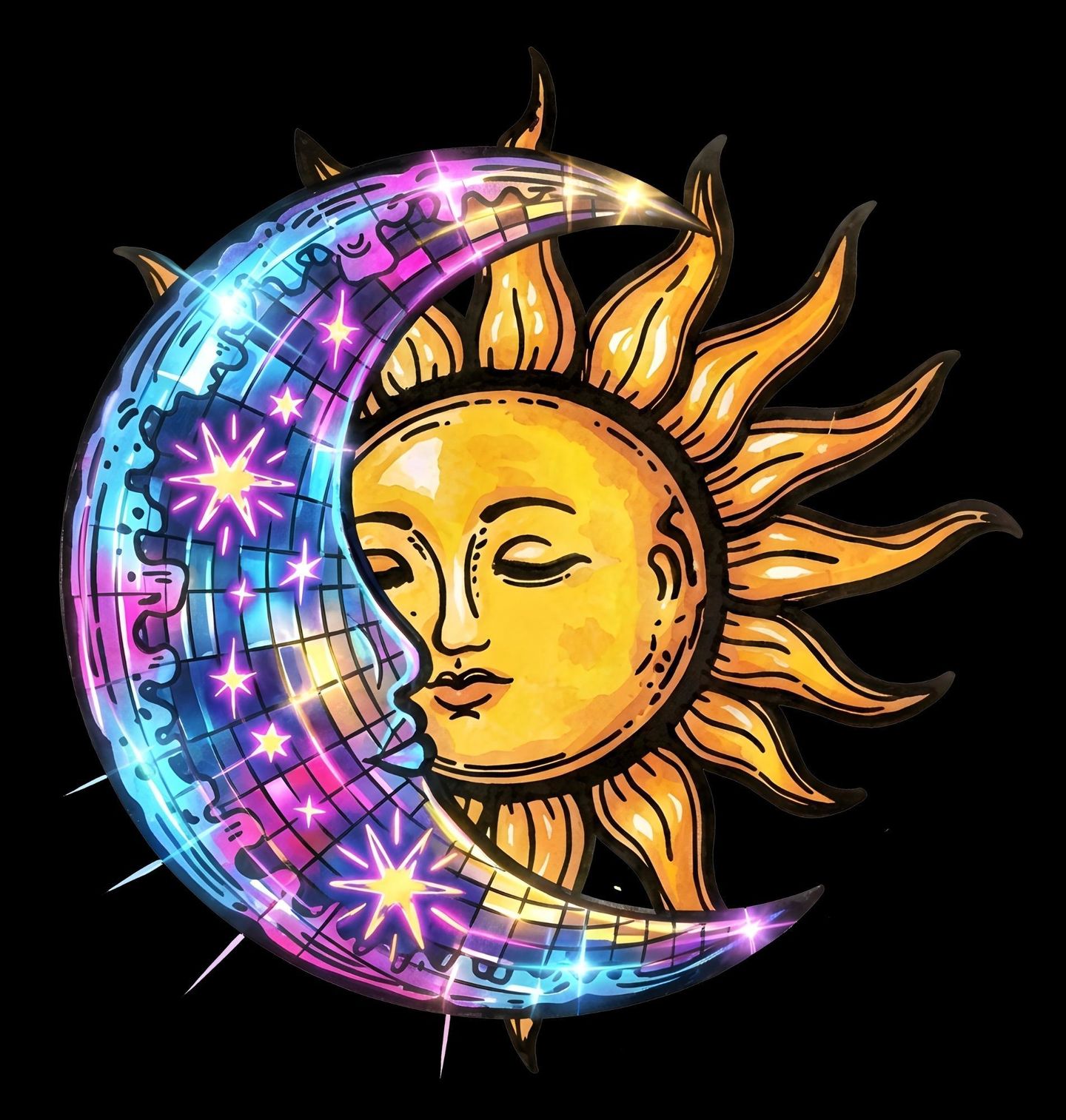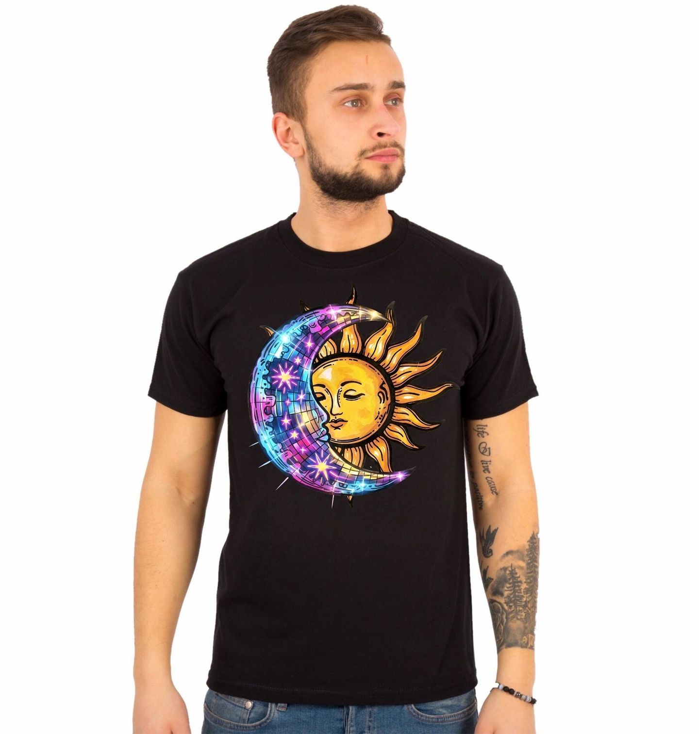 Pánské tričko Slunce a Měsíc Objetí Dne a Noci. Originální motiv zachycuje slunce a měsíc v jedinečném spojení, které symbolizuje rovnováhu mezi dnem a nocí, světlem a tmou. Slunce s jemným výrazem se prolíná s barevným měsícem, který září pestrými odlesky a vytváří magickou atmosféru.