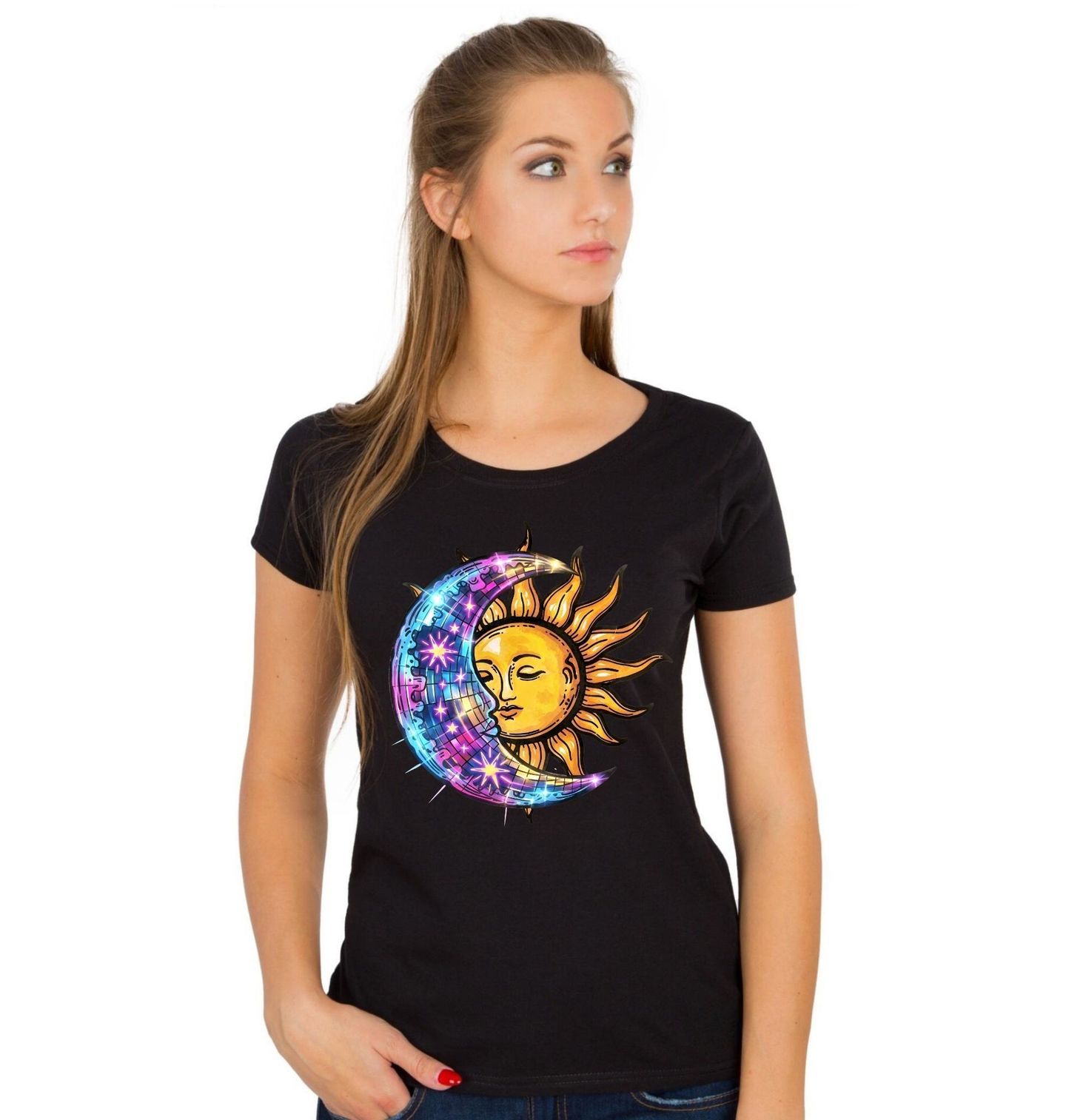 Dámské tričko Slunce a Měsíc Objetí Dne a Noci. Originální motiv zachycuje slunce a měsíc v jedinečném spojení, které symbolizuje rovnováhu mezi dnem a nocí, světlem a tmou. Slunce s jemným výrazem se prolíná s barevným měsícem, který září pestrými odlesky a vytváří magickou atmosféru.