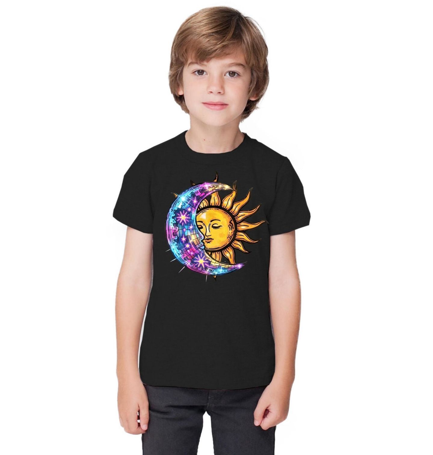 Dětské tričko Slunce a Měsíc Objetí Dne a Noci. Originální motiv zachycuje slunce a měsíc v jedinečném spojení, které symbolizuje rovnováhu mezi dnem a nocí, světlem a tmou. Slunce s jemným výrazem se prolíná s barevným měsícem, který září pestrými odlesky a vytváří magickou atmosféru.