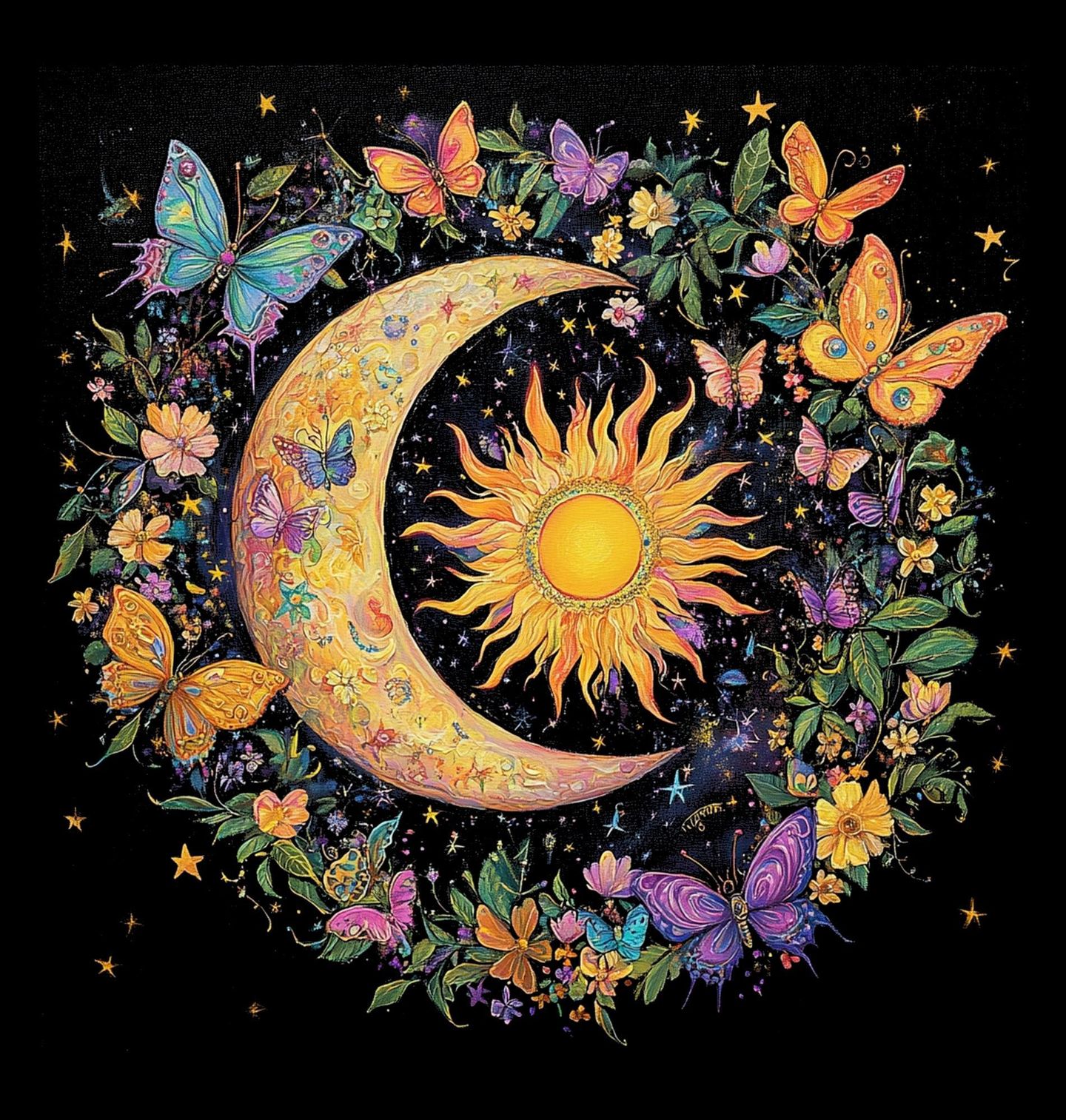 Dámské tričko Slunce a Měsíc v Motýlím Kruhu. Magický a barevný motiv propojuje světlo i tmu v dokonalé harmonii. Uprostřed kompozice září slunce a měsíc, obklopené bohatým věncem květin a pestrobarevných motýlů. Každý motýl dodává ilustraci lehkost, pohyb a hravou energii, zatímco kontrast slunce a měsíc vytváří mystickou a vyváženou atmosféru.