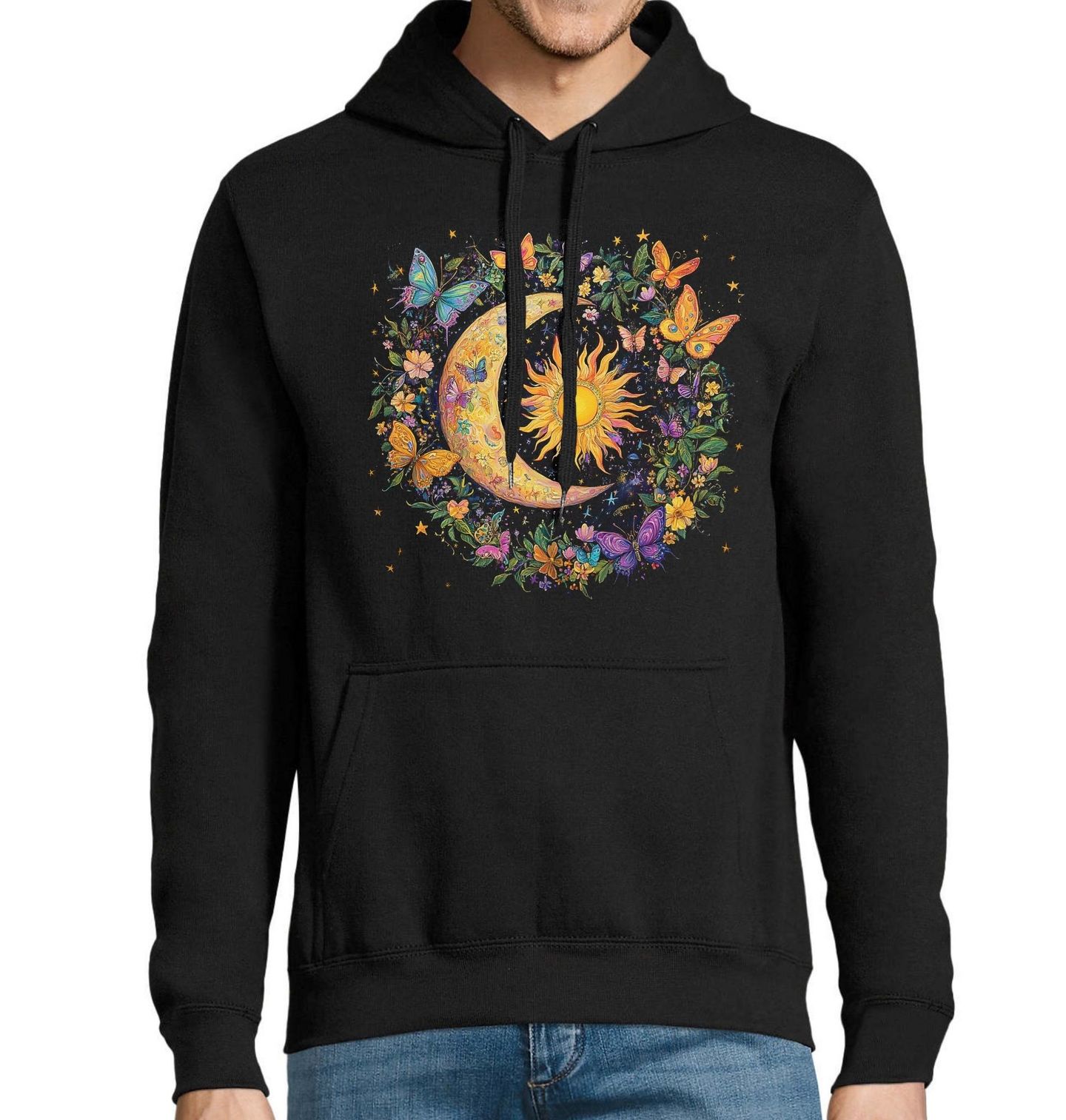 Pánská mikina Slunce a Měsíc v Motýlím Kruhu. Magický a barevný motiv propojuje světlo i tmu v dokonalé harmonii. Uprostřed kompozice září slunce a měsíc, obklopené bohatým věncem květin a pestrobarevných motýlů. Každý motýl dodává ilustraci lehkost, pohyb a hravou energii, zatímco kontrast slunce a měsíc vytváří mystickou a vyváženou atmosféru.