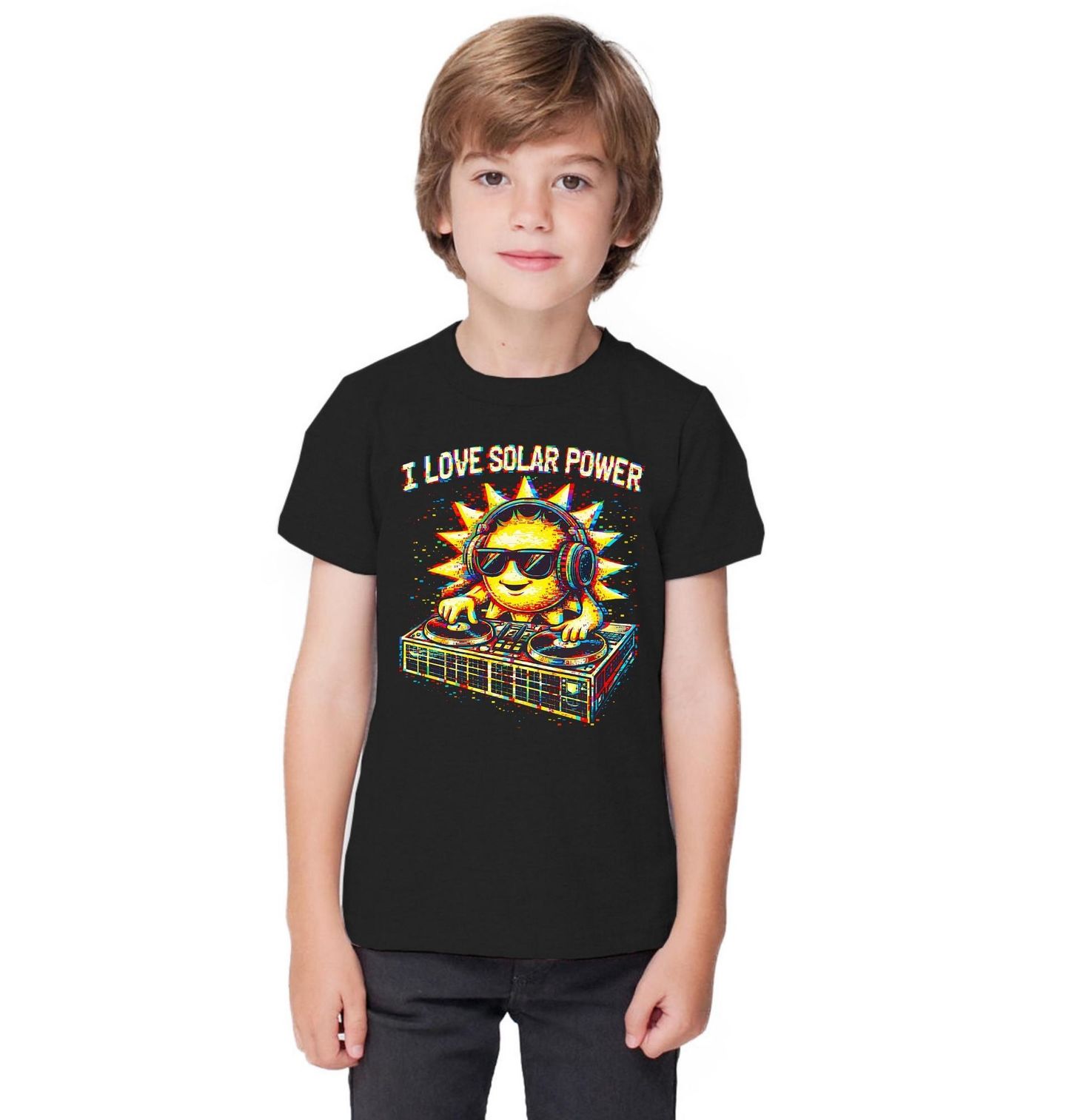 Dětské tričko Slunce jako DJ. Barevný design zachycuje stylové slunce jako DJ, které mixuje hudbu a šíří pozitivní energii. Nápis „I LOVE SOLAR POWER“ je přeložen jako „Miluji solární energii“, což dokonale vystihuje hravou kombinaci hudby a síly přírody.