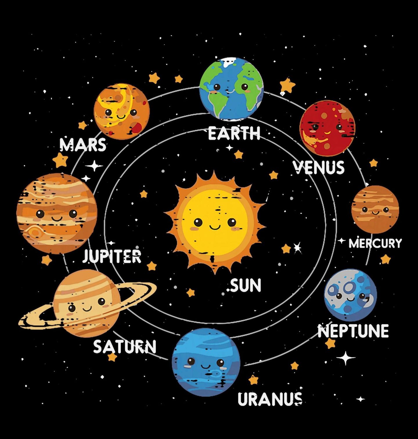 Dámské tričko Sluneční Soustava pro Děti. Barevné planety s obličeji a popisky jako Earth, Mars, Jupiter, Saturn apod. (Země, Mars, Jupiter, Saturn). Ideální pro vzdělávání i zábavu. Skvělý motiv pro milovníky vesmíru a planet.