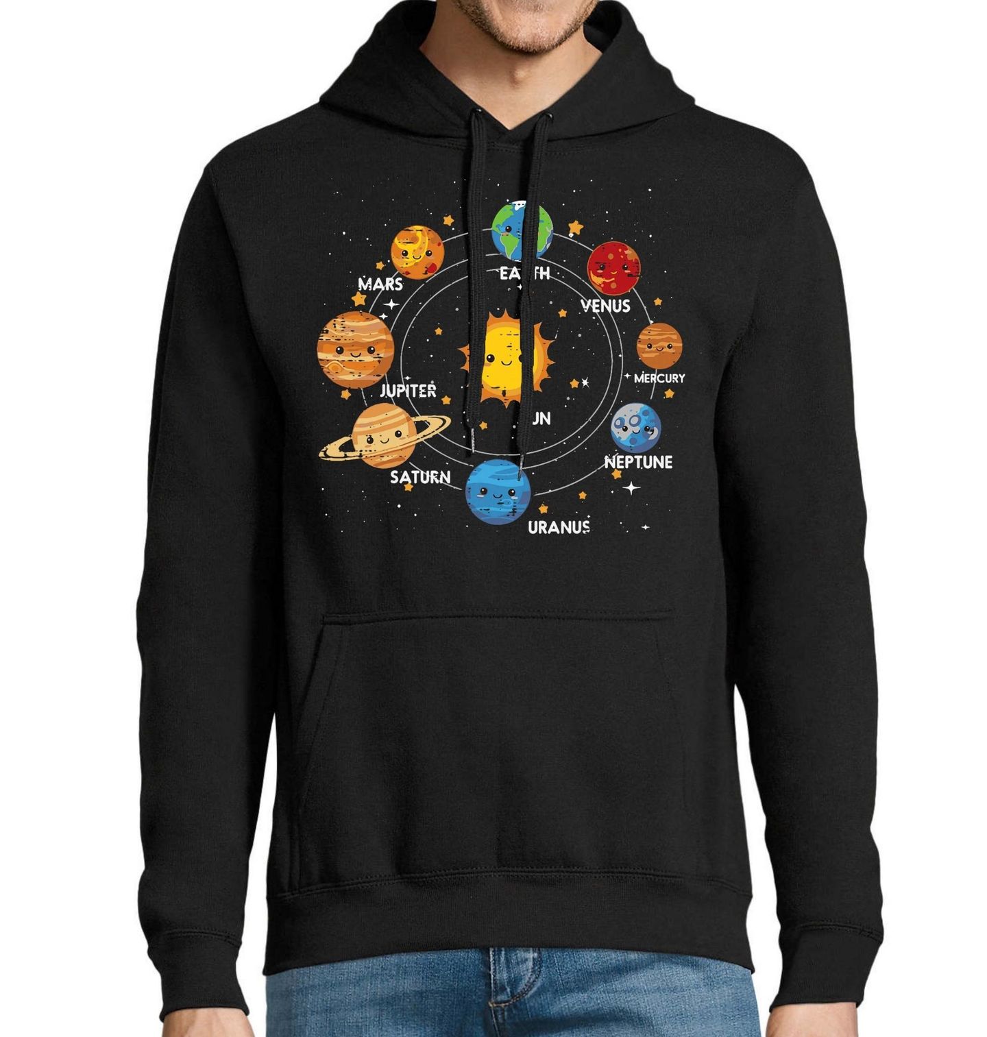 Pánská mikina Sluneční Soustava pro Děti. Barevné planety s obličeji a popisky jako Earth, Mars, Jupiter, Saturn apod. (Země, Mars, Jupiter, Saturn). Ideální pro vzdělávání i zábavu. Skvělý motiv pro milovníky vesmíru a planet.