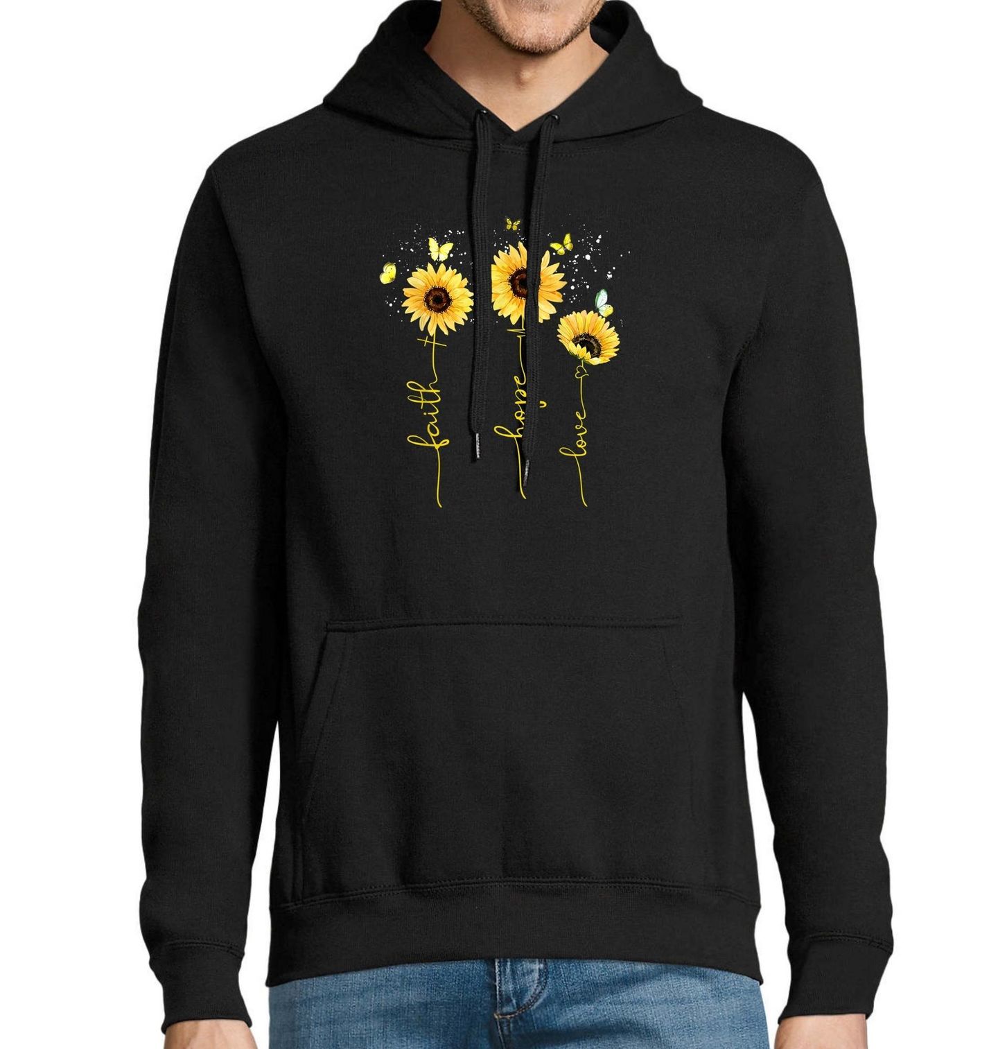 Pánská mikina Slunečnice a Motýli Faith Hope Love. Něžný a pozitivní motiv slunečnice doplněný o jemné motýly a inspirativní poselství. Na obrázku jsou tři žluté slunečnice, kolem kterých poletuje několik motýlů, a do jejich stonků jsou kaligraficky zakomponovaná slova: Faith – Víra, Hope – Naděje, Love – Láska.