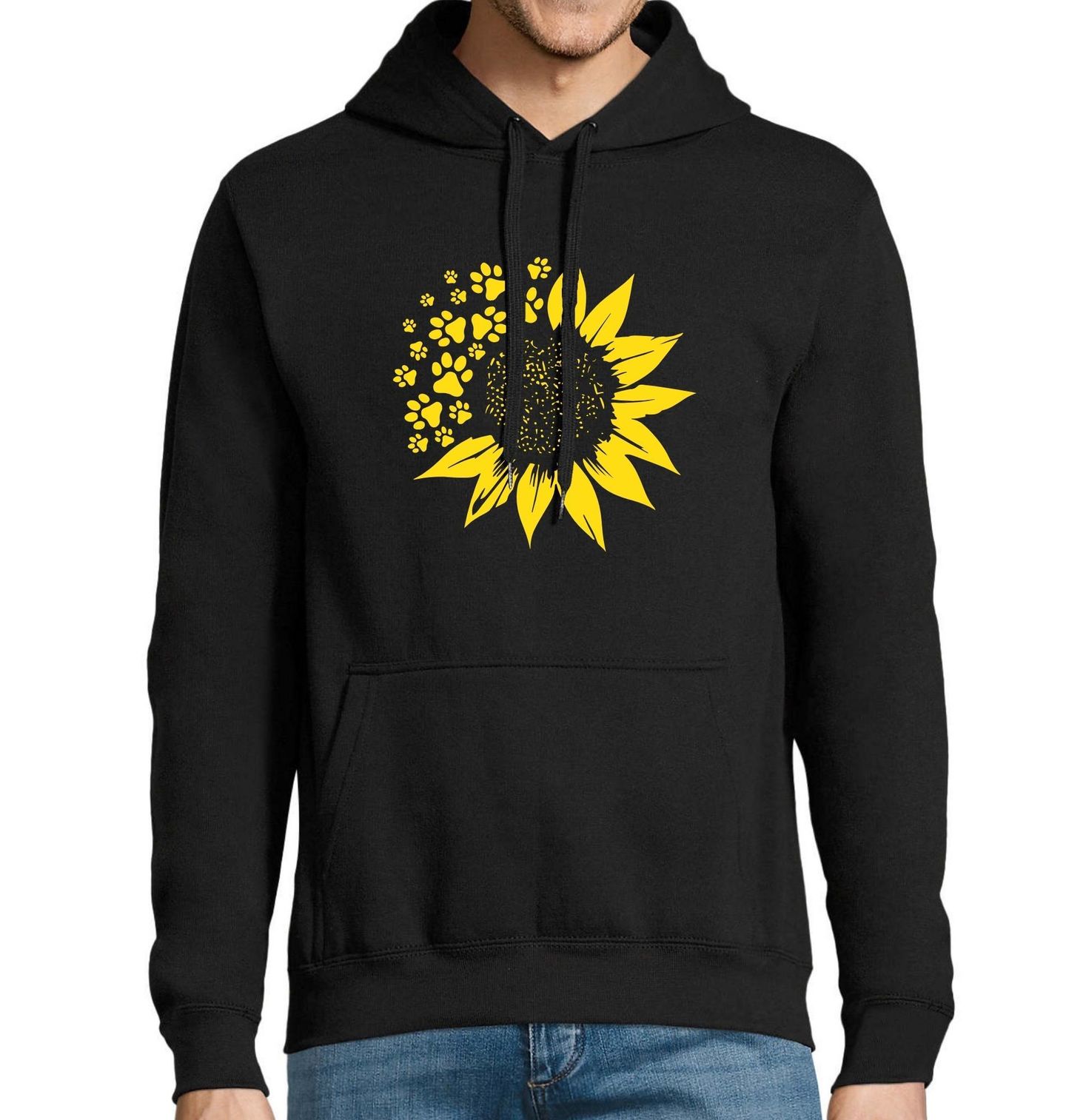 Pánská mikina Slunečnice a Psí Tlapky. Tričko Slunečnice a tlapky spojuje to nejkrásnější z přírody – zářivou slunečnici jako symbol radosti a otisky tlapek, které zanechávají nezaměnitelnou stopu v našem srdci. Motiv je ideální pro každého pejskaře, který miluje nejen svého psa, ale i květiny a pozitivní energii. Tato stylová kombinace barev a symboliky dává jasně najevo, že svět je krásnější, tam kde je pes a květiny.