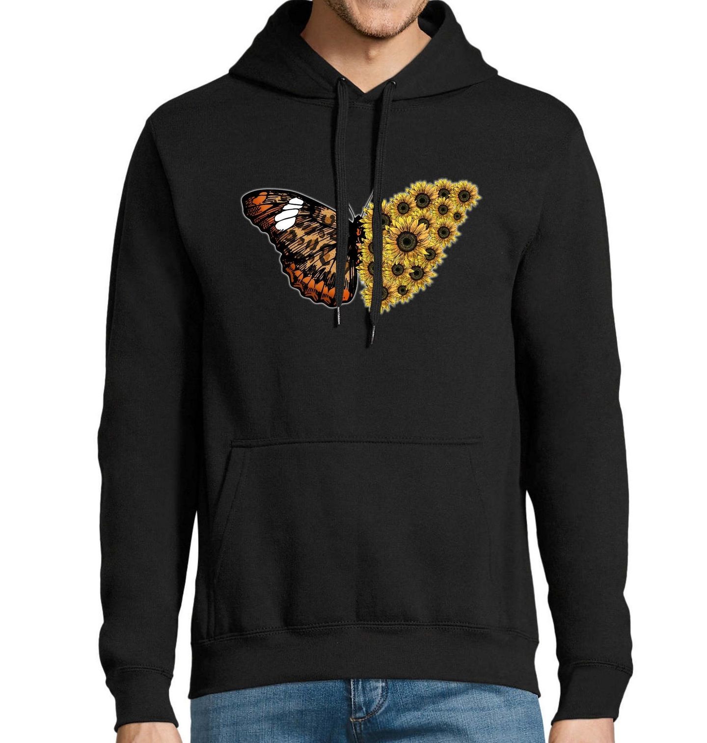 Pánská mikina Slunečnicový Motýl Babočka Sunflower Butterfly. Tento nádherný motiv spojuje motýla a slunečnice v harmonické jarní kompozici plné květin a svěžesti. Perfektní volba pro milovníky přírody, květin a jarního rozkvětu, kteří chtějí svůj styl obohatit o kouzlo probouzející se přírody.