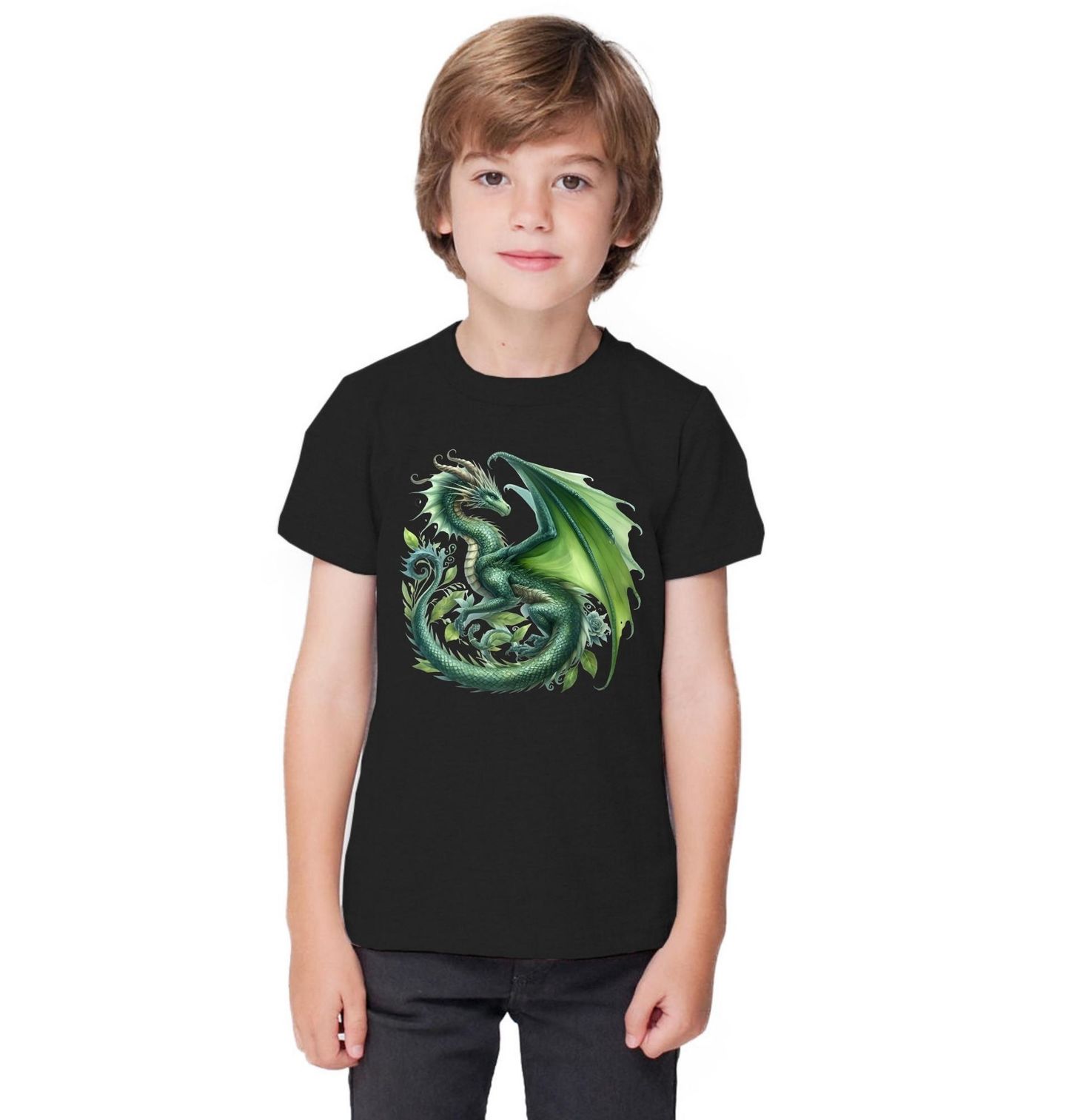Dětské tričko Smaragdový Drak mezi Listy. Elegantní zelený drak se vznáší mezi listy a působí, jako by právě vystoupil z magického světa fantasy. Jemné detaily šupin, křídel i rostlinných motivů vytvářejí harmonický a zároveň tajemný design, který si zamilují všichni fanoušci kouzel, příběhů a mystických bytostí.