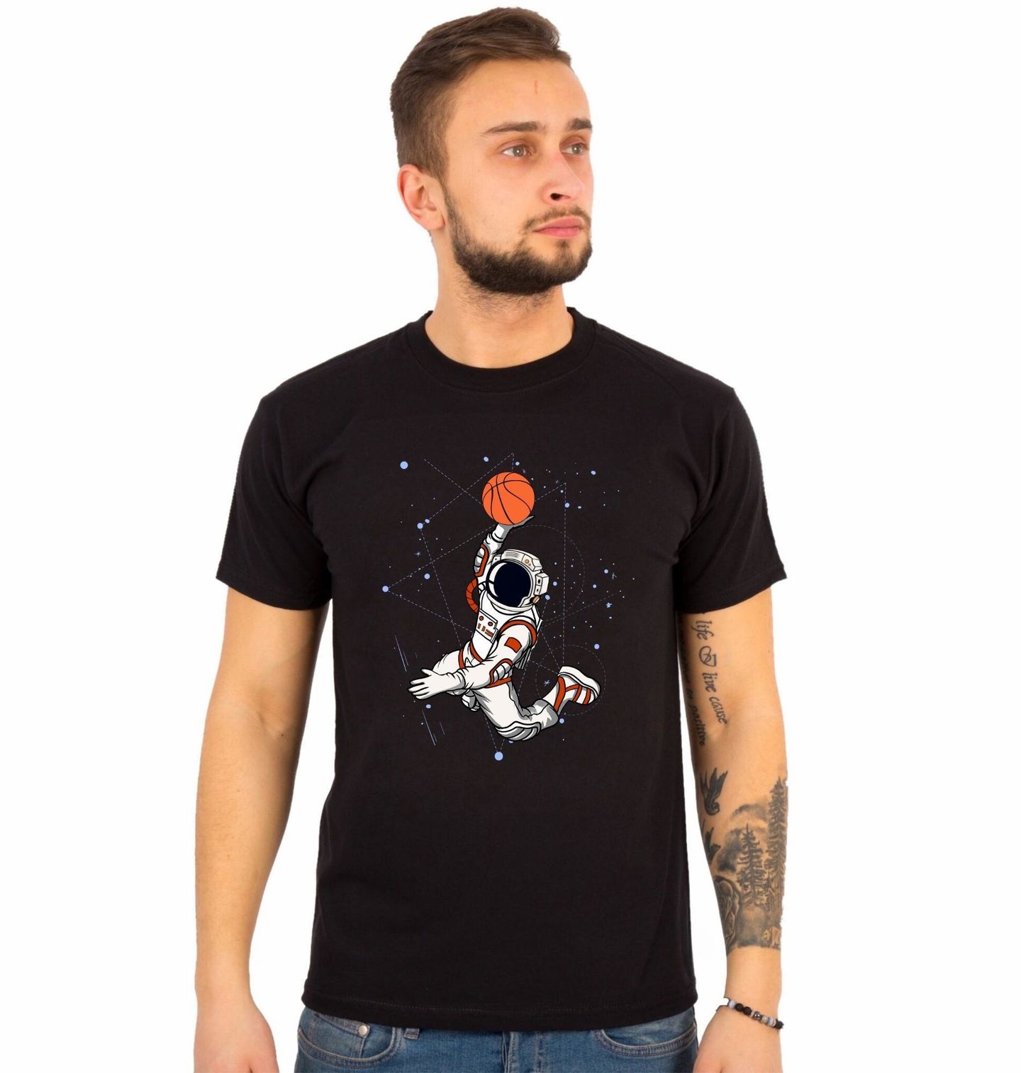 Pánské tričko Smečující Astronaut Basketbalista. Astronaut ve skafandru, který se s neuvěřitelnou lehkostí vznáší a smečuje basketbalový míč, ztělesňuje kombinaci odvahy, síly a snu. Ideální pro všechny, jejichž srdce bije pro basketbal a kteří chtějí mít kousek vesmíru na sobě.