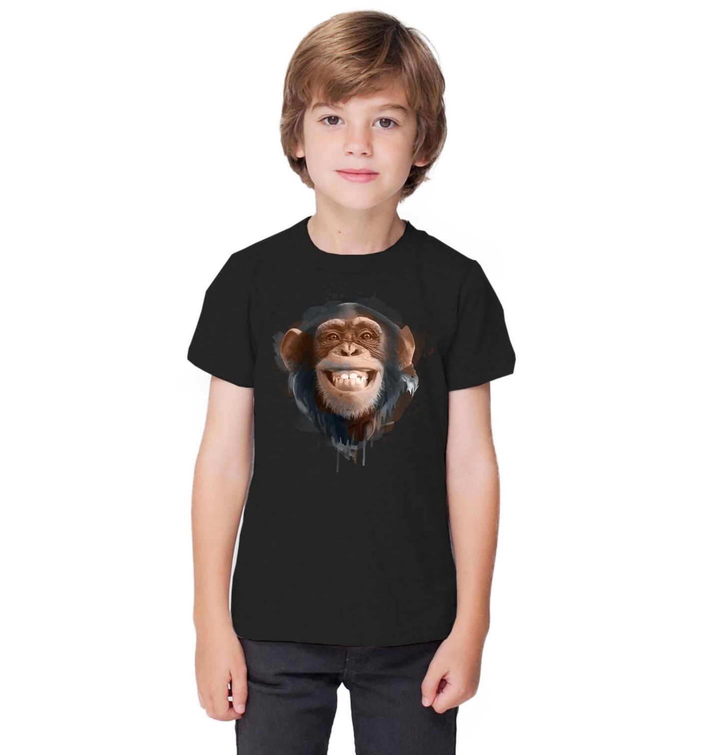 Dětské tričko Smějící se Šimpanz. Tato smějící se opice je jednou z nejinteligentnějších opic na světě, s nakažlivým úsměvem a lidským výrazem. Motiv je ideální pro milovníky zvířat, přírody a originálního umění, kteří mají smysl pro humor a chtějí něco výrazného a pozitivního.
