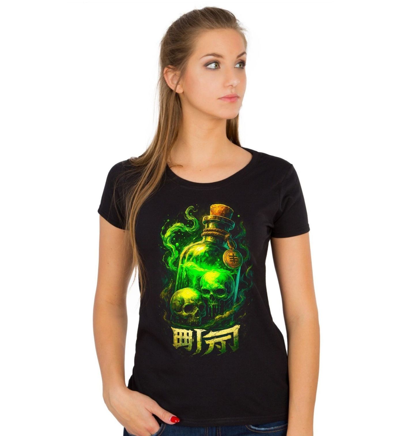 Dámské tričko Smrtící Elixír. Temný motiv, který v sobě spojuje nebezpečí, mystiku a sílu zakázaných látek. Zeleně zářící jed uzavřený v lahvi obklopuje lebka, symbol smrti a pomíjivosti, zatímco toxické výpary vytvářejí hypnotizující a děsivou atmosféru. Tento design působí jako zakázaný artefakt – jed, který nese příběh zkázy, a lebka jako jeho tichý svědek. Výrazné kontrasty, neonové tóny a detailní zpracování dělají z motivu nepřehlédnutelný kousek pro všechny fanoušky hororu.