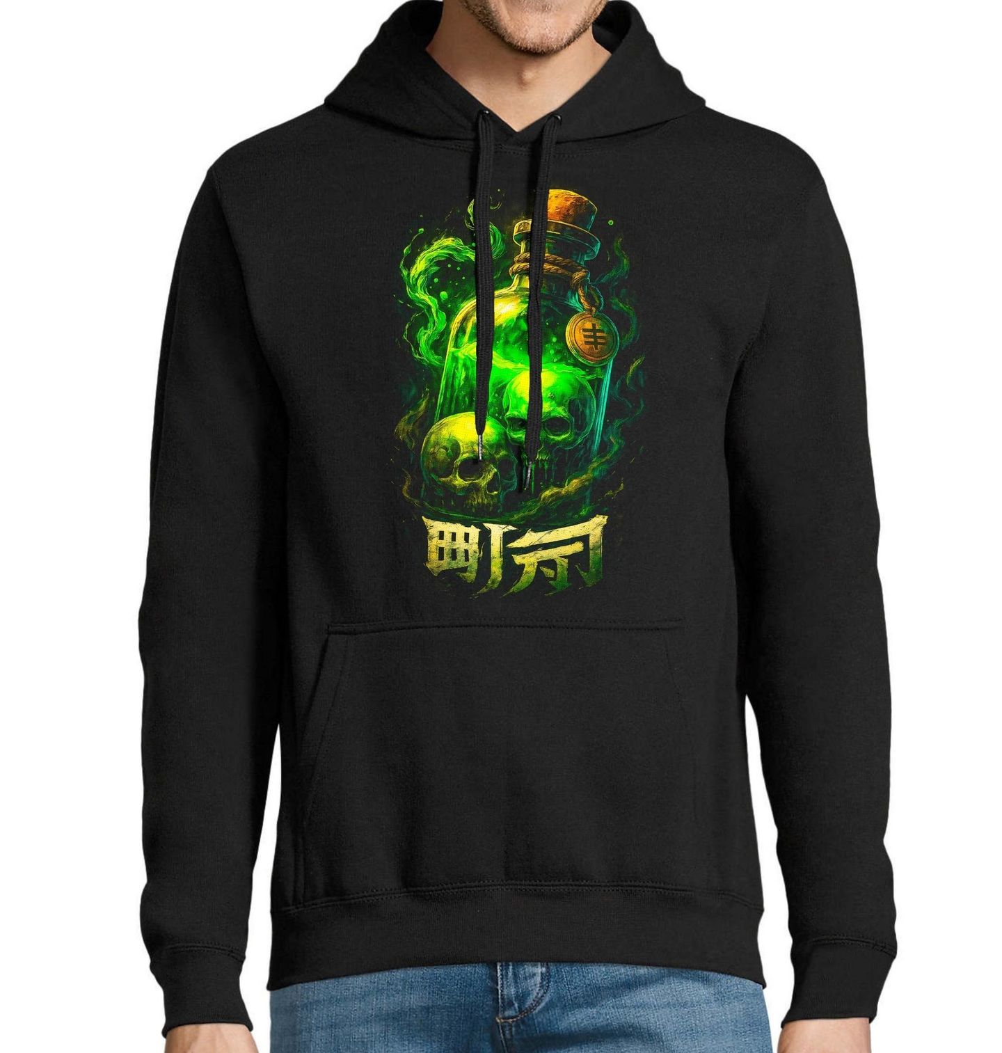 Pánská mikina Smrtící Elixír. Temný motiv, který v sobě spojuje nebezpečí, mystiku a sílu zakázaných látek. Zeleně zářící jed uzavřený v lahvi obklopuje lebka, symbol smrti a pomíjivosti, zatímco toxické výpary vytvářejí hypnotizující a děsivou atmosféru. Tento design působí jako zakázaný artefakt – jed, který nese příběh zkázy, a lebka jako jeho tichý svědek. Výrazné kontrasty, neonové tóny a detailní zpracování dělají z motivu nepřehlédnutelný kousek pro všechny fanoušky hororu.