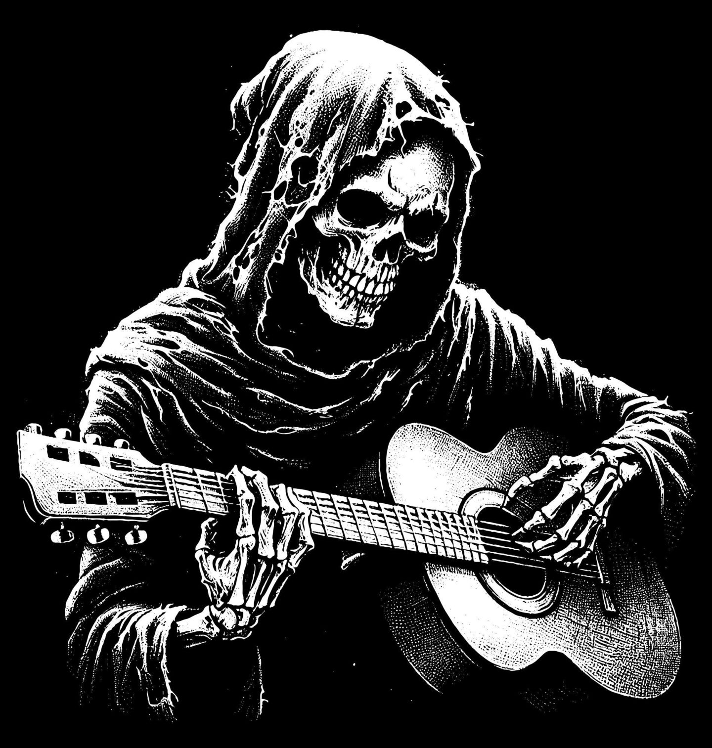 Pánské tričko Smrtka s Akustickou Kytarou. Originální motiv, kde kostlivec a temná kytara, spojuje temnotu, humor a rockový styl. Tenhle design je jako stvořený pro milovníky hudby, metalu, gotiky i temné estetiky. Ideální jako dárek pro muzikanty, rockery i fanoušky netradiční grafiky.